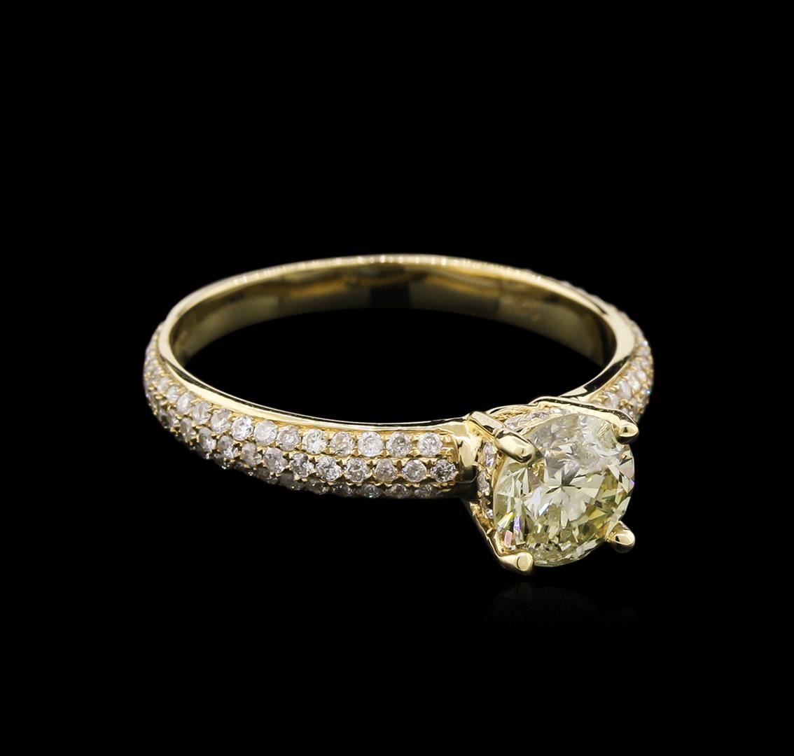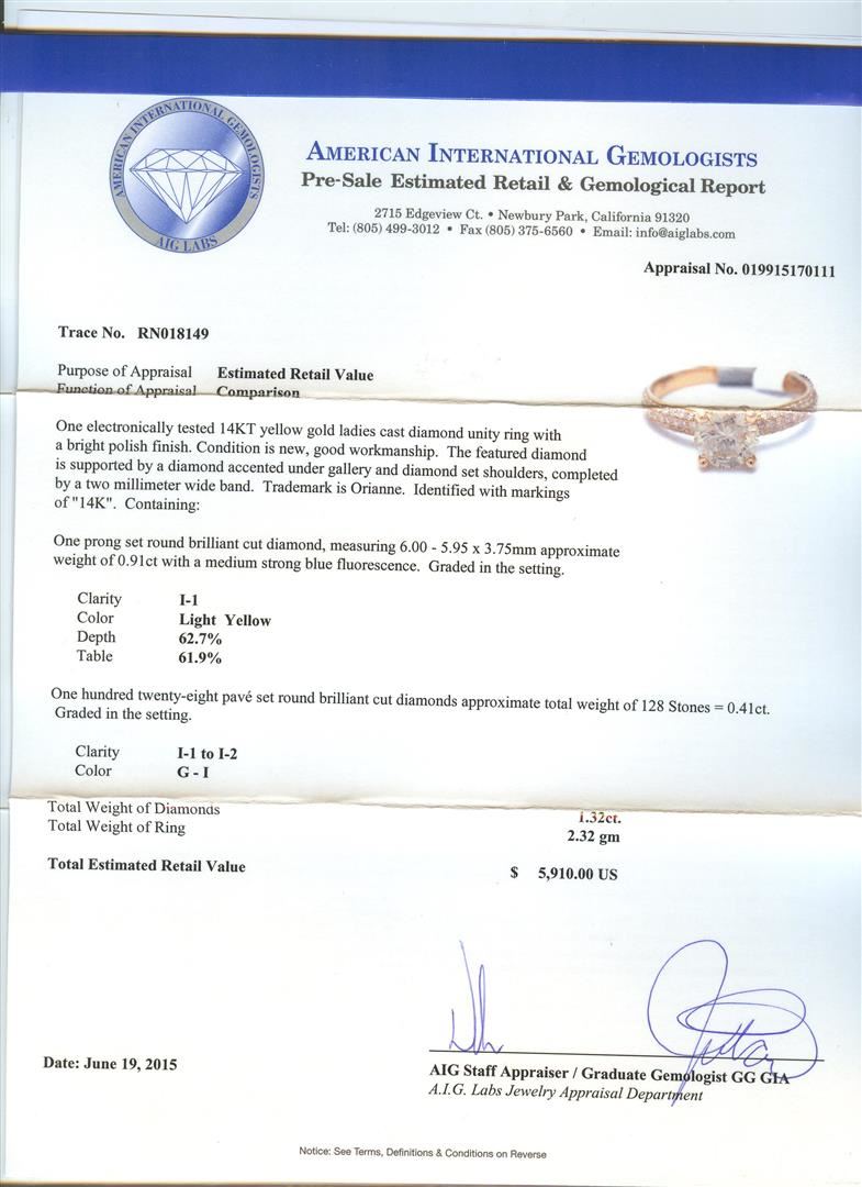 One electronically tested 14KT yellow gold ladies cast diamond unity ring with a bright polish finish. The featured diamond is supported by a diamond accented under gallery and diamond set shoulders, completed by a two millimeter wide band. Trademark is Orianne. Identified with markings of "14K". Condition is new, good workmanship. Containing: One prong set round brilliant cut diamond, measuring 6.00 - 5.95 x 3.75mm approximate weight of 0.91ct with a medium strong blue fluorescence. Graded in the setting. Clarity: I-1. Depth: 62.7%. Table 61.9%. One Hundred Twenty-Eight pave‚ set round brilliant cut diamonds approximate total weight of 128 Stones = 0.41ct. Graded in the setting. Clarity: I-1 to I-2. Color: G - I. Total Weight of Diamonds 1.32ct. AIG Appraised at $5,910.00.