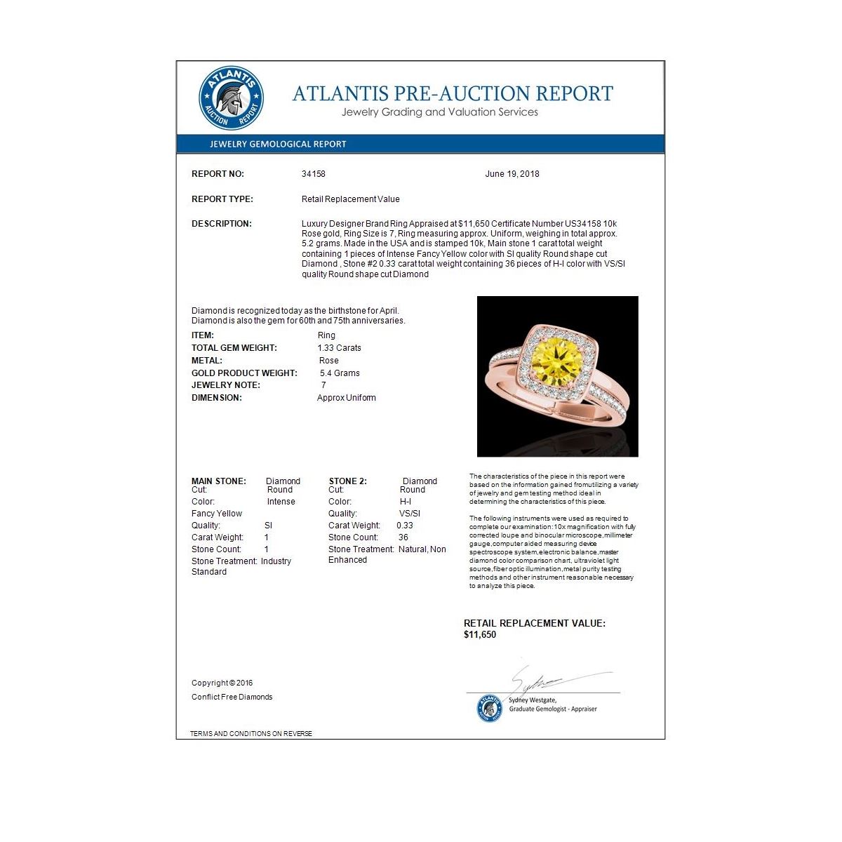 REF-176K4W -34158 ---- 1.33 CTW Certified Si/I Fancy Intense Yellow Diamond Solitaire Halo Ring 10K Rose Gold ---- Luxury Designer Brand Ring Appraised at $11,650 Certificate Number US34158 10k Rose gold, Ring Size is 7, Ring measuring approx. Uniform, weighing in total approx. 5.2 grams. Made in the USA and is stamped 10k, Main stone 1 carat total weight containing 1 pieces of Intense Fancy Yellow color with SI quality Round shape cut Diamond , Stone #2 0.33 carat total weight containing 36 pieces of H-I color with VS/SI quality Round shape cut Diamond