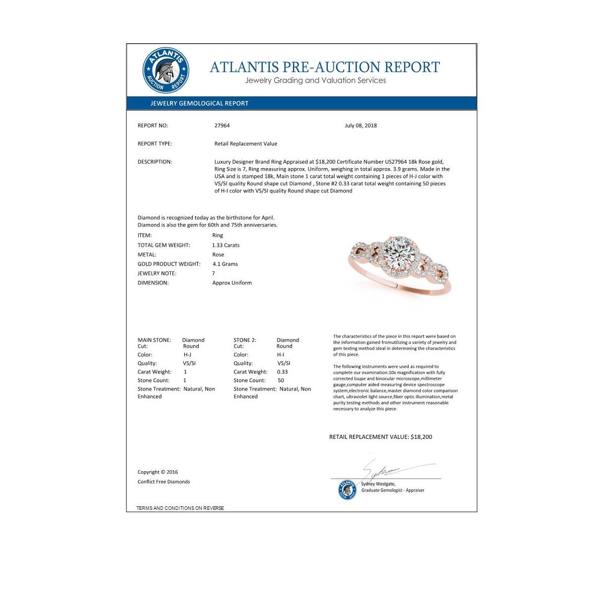 REF-367A5X -27964 ---- 1.33 CTW Certified VS/SI Diamond Solitaire Ring 18K Rose Gold ---- Luxury Designer Brand Ring Appraised at $18,200 Certificate Number US27964 18k Rose gold, Ring Size is 7, Ring measuring approx. Uniform, weighing in total approx. 3.9 grams. Made in the USA and is stamped 18k, Main stone 1 carat total weight containing 1 pieces of H-J color with VS/SI quality Round shape cut Diamond , Stone #2 0.33 carat total weight containing 50 pieces of H-I color with VS/SI quality Round shape cut Diamond
