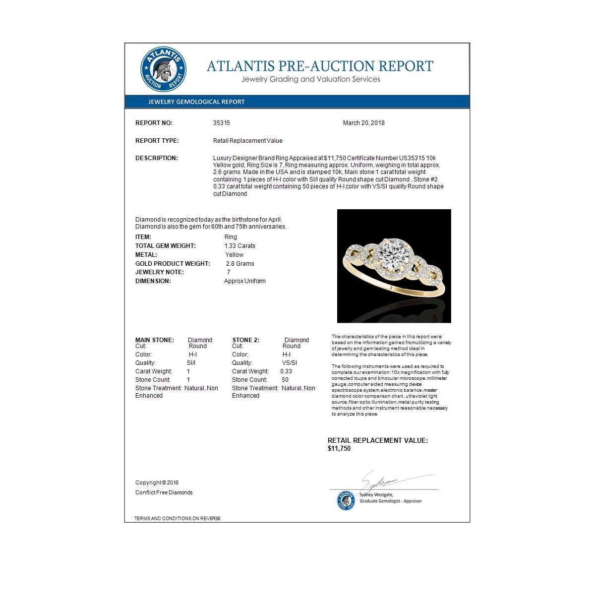REF-213A6X -35315 ---- 1.33 CTW H-SI/I Certified Diamond Solitaire Ring 10K Yellow Gold ---- Luxury Designer Brand Ring Appraised at $11,750 Certificate Number US35315 10k Yellow gold, Ring Size is 7, Ring measuring approx. Uniform, weighing in total approx. 2.6 grams. Made in the USA and is stamped 10k, Main stone 1 carat total weight containing 1 pieces of H-I color with SI/I quality Round shape cut Diamond , Stone #2 0.33 carat total weight containing 50 pieces of H-I color with VS/SI quality Round shape cut Diamond