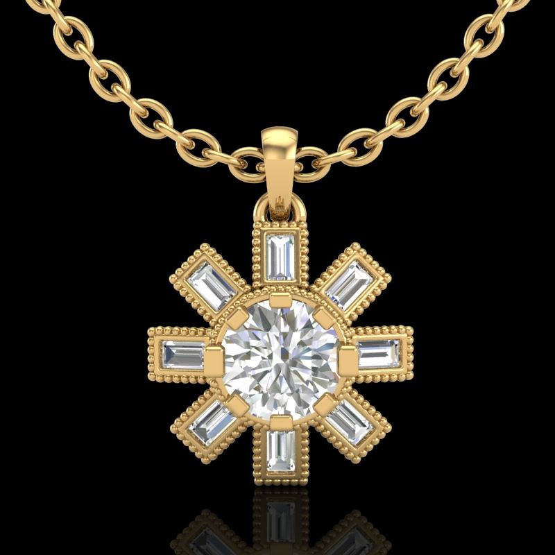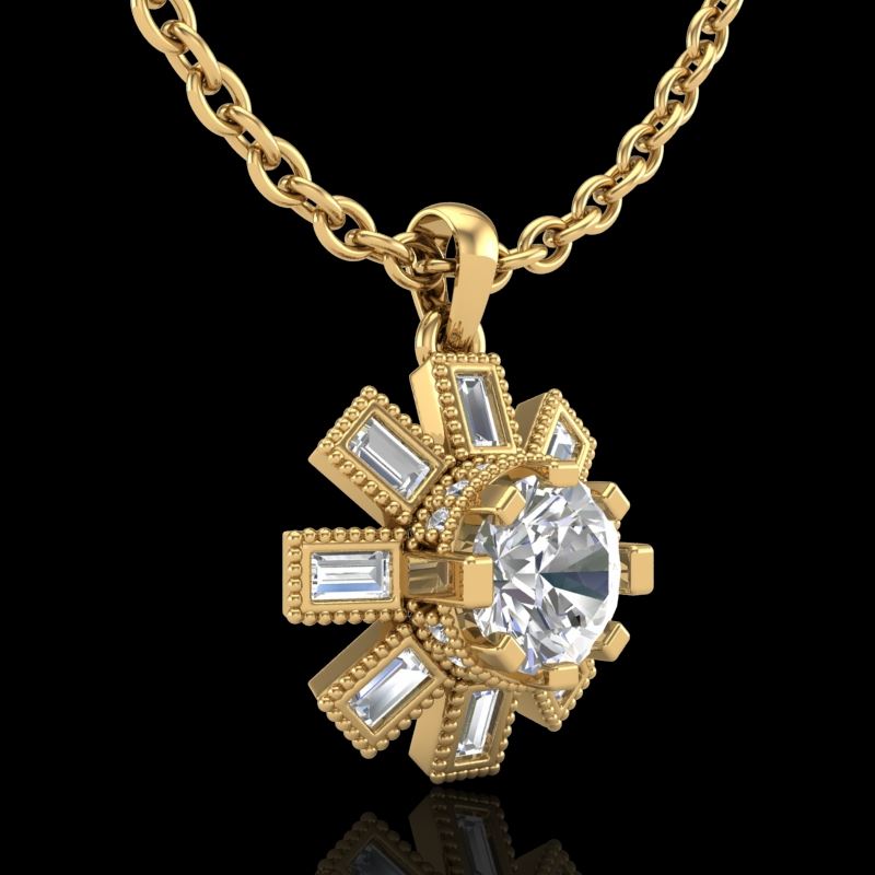 REF-220W9F -37069 ---- 1.33 CTW VS/SI Diamond Solitaire Art Deco Necklace 18K Yellow Gold ---- Luxury Designer Brand NECKLACE Appraised at $12,150 Certificate Number US37069 18k Yellow gold, NECKLACE Size is 16 Inches, NECKLACE measuring approx. Uniform, weighing in total approx. 5.3 grams. Made in the USA and is stamped 18k, Main stone 0.76 carat total weight containing 1 pieces of H-J color with VS/SI quality Round shape cut Diamond , Stone #2 0.12 carat total weight containing 14 pieces of H-I color with VS/SI quality Round shape cut Diamond , Stone #3 0.45 carat total weight containing 8 pieces of G-H color with VS/SI quality Baguette shape cut Diamond