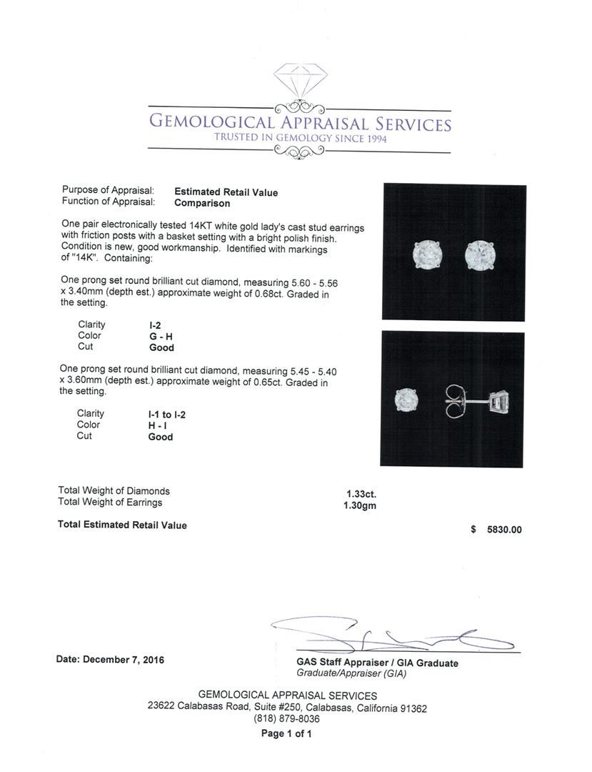 One pair electronically tested 14KT white gold lady's cast stud earrings with friction posts with a basket setting with a bright polish finish. Identified with markings of '14K'. Condition is new, good workmanship. Containing: One prong set round brilliant cut diamond, measuring 5.60 - 5.56 x 3.40mm (depth est.) approximate weight of 0.68ct. Graded in the setting. Clarity I-2. Color: G - H Cut Good One prong set round brilliant cut diamond, measuring 5.45 - 5.40 x 3.60mm (depth est.) approximate weight of 0.65ct. Graded in the setting. Clarity I-1 to I-2. Color: H - I Cut Good. Total Weight of Diamonds 1.33ct.. Total Weight of Earrings 1.30gm. GAS Appraised at $5,830.00.