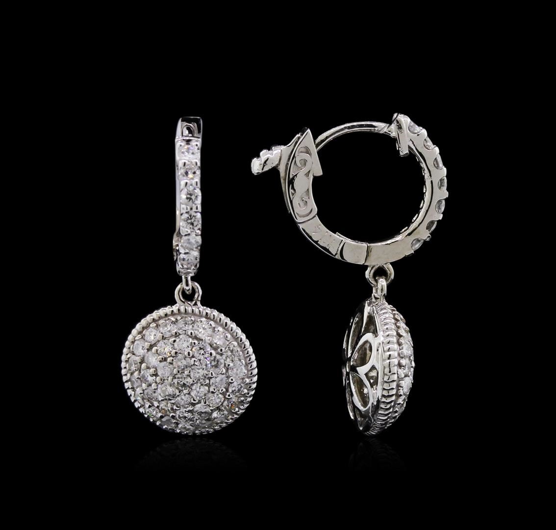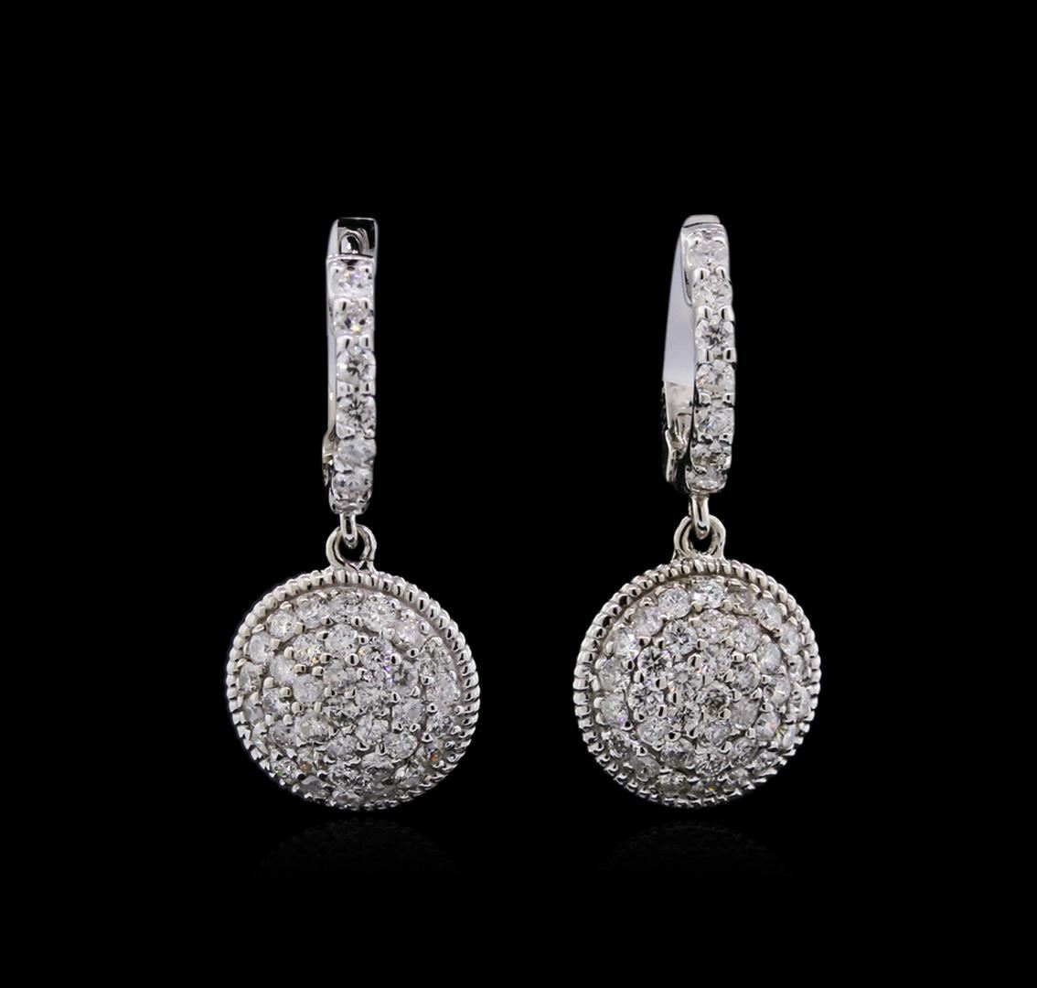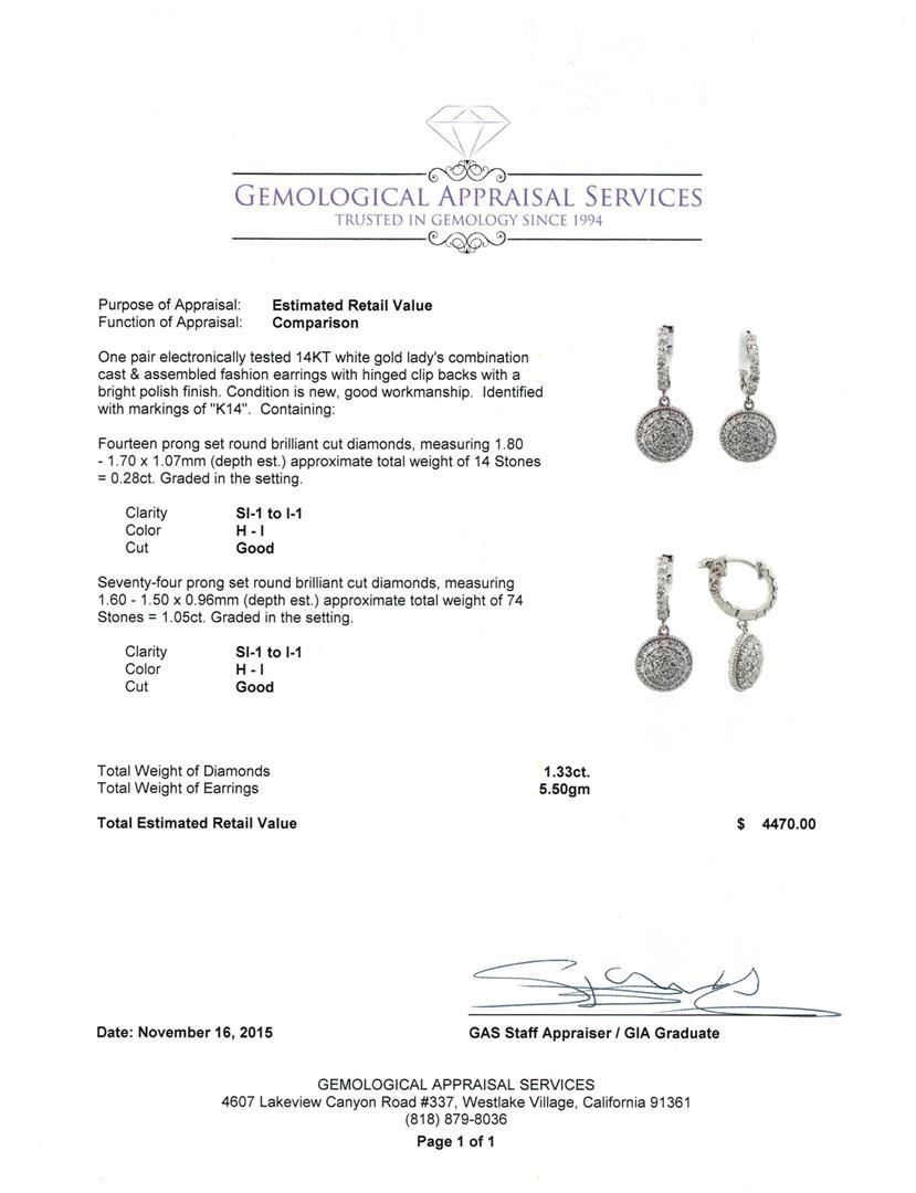 One pair electronically tested 14KT white gold lady's combination cast & assembled fashion earrings with hinged clip backs with a bright polish finish. Identified with markings of "K14". Condition is new, good workmanship. Containing: Fourteen prong set round brilliant cut diamonds, measuring 1.80 - 1.70 x 1.07mm (depth est.) approximate total weight of 14 Stones = 0.28ct. Graded in the setting. Clarity: SI-1 to I-1. Color: H - I. Cut Good Seventy-Four prong set round brilliant cut diamonds, measuring 1.60 - 1.50 x 0.96mm (depth est.) approximate total weight of 74 Stones = 1.05ct. Graded in the setting. Clarity: SI-1 to I-1. Color: H - I. Cut Good. Total Weight of Diamonds 1.33ct. Total Weight of Earrings 5.50gm. GAS Appraised at $4,470.00.