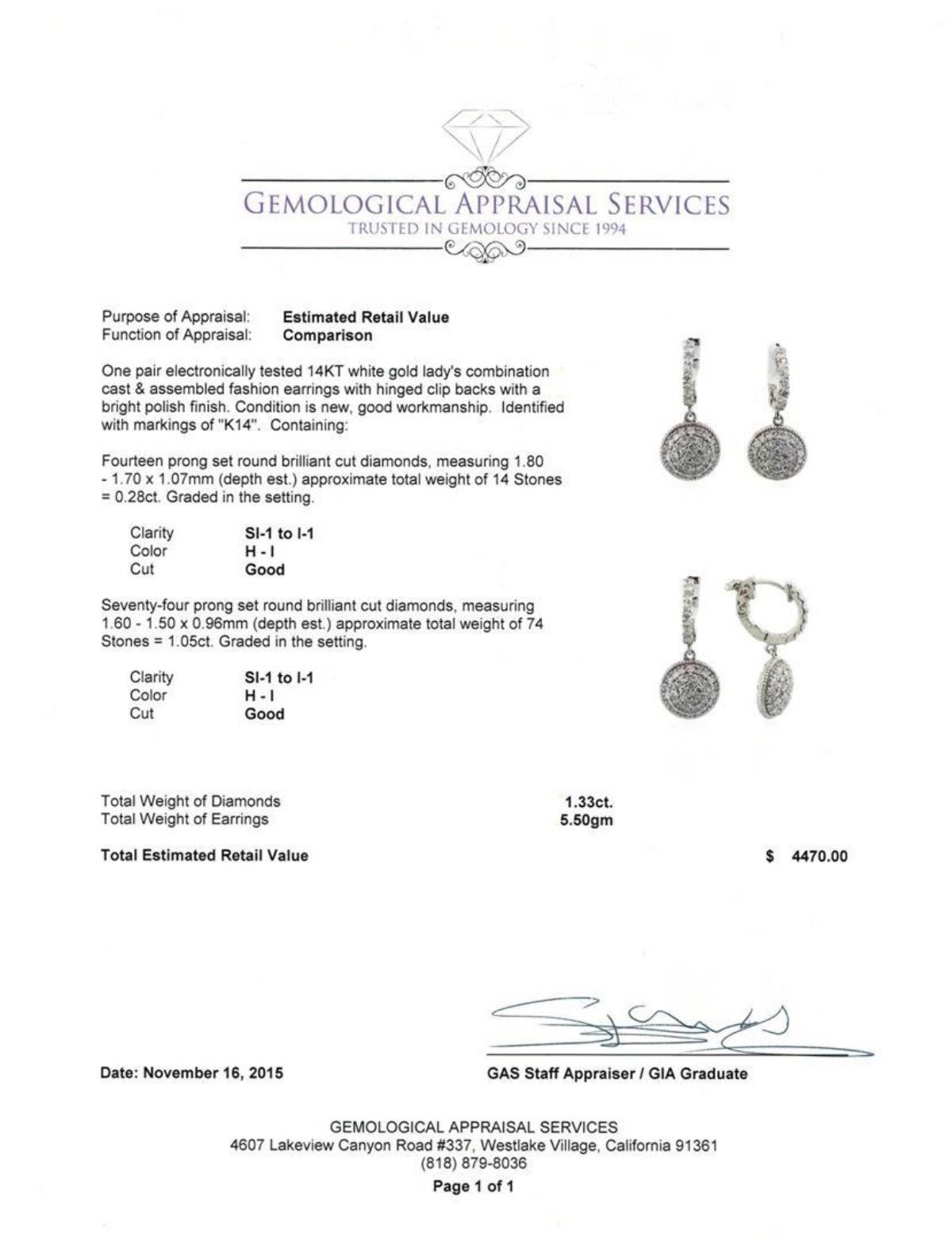 One pair electronically tested 14KT white gold lady's combination cast & assembled fashion earrings with hinged clip backs with a bright polish finish. Identified with markings of "K14". Condition is new, good workmanship. Containing: Fourteen prong set round brilliant cut diamonds, measuring 1.80 - 1.70 x 1.07mm (depth est.) approximate total weight of 14 Stones = 0.28ct. Graded in the setting. Clarity: SI-1 to I-1. Color: H - I. Cut Good Seventy-Four prong set round brilliant cut diamonds, measuring 1.60 - 1.50 x 0.96mm (depth est.) approximate total weight of 74 Stones = 1.05ct. Graded in the setting. Clarity: SI-1 to I-1. Color: H - I. Cut Good. Total Weight of Diamonds 1.33ct. Total Weight of Earrings 5.50gm. GAS Appraised.