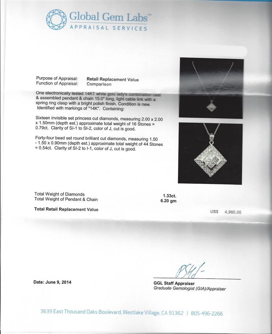 One electronically tested 14KT white gold lady's combination cast and assembled pendant and chain 15.0" long, light cable link with a spring ring clasp with a bright polish finish. Condition is new. Identified with markings of "14K." Containing: Sixteen invisible set princess cut diamonds, measuring 2.00 x 2.00 x 1.50 mm (depth est.) approximate total weight of 16 stones = 0.79ct. Clarity of SI-1 to SI-2, color J, cut is good. Forty-four bead set round brilliant cut diamonds, measuring 1.50 - 1.50 x 0.90mm (depth est.) approximate total weight of 44 stones = 0.54ct. Clarity of SI-2 - I-1, color of J, cut is good. Total weight of diamonds = 1.33ct. Total weight of pendant and chain = 6.20 gm. GGL Appraised at $4,960.00.