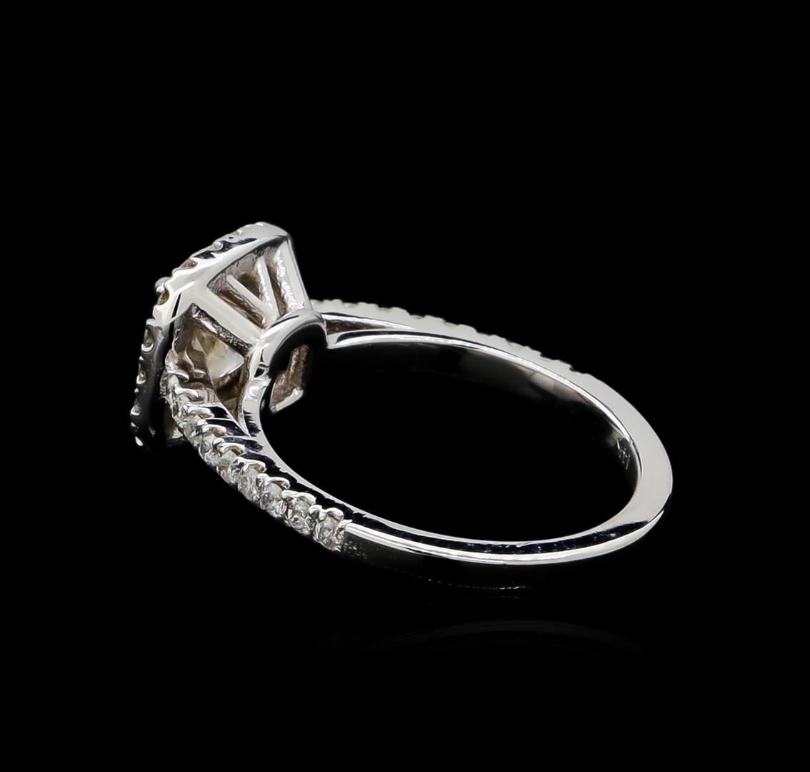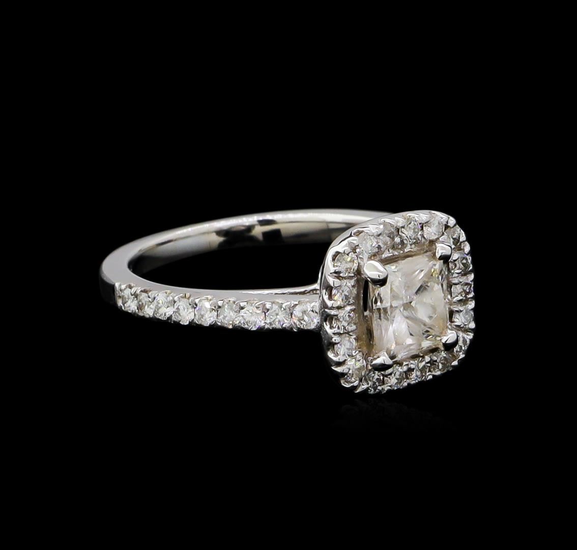 One electronically tested 14KT white gold ladies cast diamond unity ring with a bright polish finish. The featured diamond is set within a diamond bezel supported by diamond set shoulders, completed by a one and one-half millimeter wide band. Identified with markings of "14K". Condition is new, good workmanship. Containing: One prong set princess rectangular cut diamond, measuring 5.40 x 5.10 x 3.50mm (depth est.) approximate weight of 0.91ct with a strong blue fluorescence. Graded in the setting. Clarity: I-2. Color: 68.6%. Table 74.5%. Thirty-Six prong set round brilliant cut diamonds approximate total weight of 36 Stones = 0.42ct. Graded in the setting. Clarity: SI-2 to I-2. Color: G - I. Total Weight of Diamonds 1.33ct. Total Weight of Ring 3.49gm. AIG Appraised at $5,740.00.