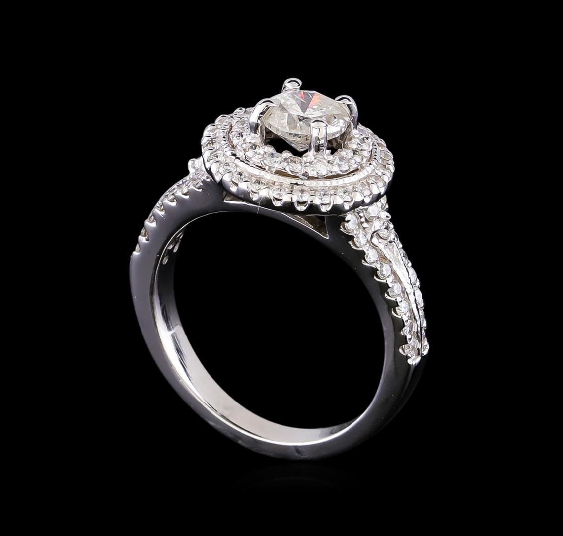 One electronically tested 14KT white gold lady's cast wedding ring with a double halo with a bright polish finish. The featured lady's ring has a shank measuring 2.58 millimeters in width. Identified with markings of "14K". Condition is new, good workmanship. Containing: One prong set round brilliant cut diamond, measuring 5.44 - 5.41 x 3.60mm (depth est.) , 5.00.%. GTCF approximate weight of 0.70ct. Graded in the setting. Clarity: I-1. Color: Good Twenty prong set round brilliant cut diamonds, measuring 1.40 - 1.30 x 0.84mm (depth est.) approximate total weight of 20 Stones = 0.20ct. Graded in the setting. Clarity: SI-1 to SI-2. Color: H - I. Cut Good Fifty-Six prong set round brilliant cut diamonds, measuring 1.30 - 1.20 x 0.78mm (depth est.) approximate total weight of 56 Stones = 0.43ct. Graded in the setting. Clarity: SI-1 to SI-2. Color: H - I. Cut Good. Total Weight of Diamonds 1.33ct. Total Weight of Ring 5.80gm GAS Appraised at $6,140.00.