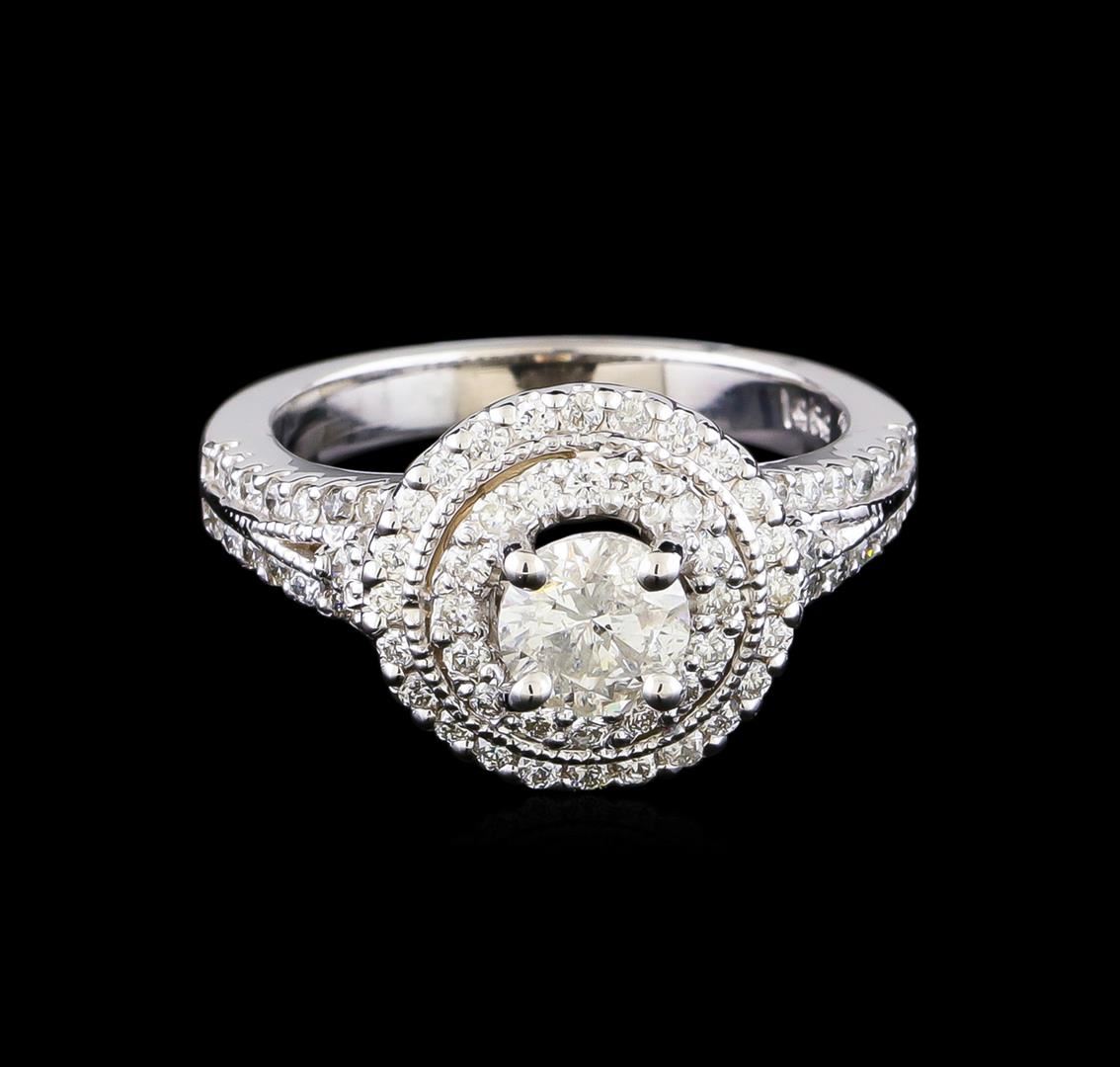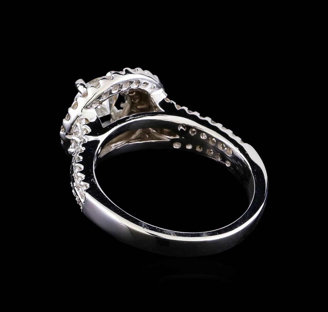 One electronically tested 14KT white gold lady's cast wedding ring with a double halo with a bright polish finish. The featured lady's ring has a shank measuring 2.58 millimeters in width. Identified with markings of "14K". Condition is new, good workmanship. Containing: One prong set round brilliant cut diamond, measuring 5.44 - 5.41 x 3.60mm (depth est.) , 5.00.%. GTCF approximate weight of 0.70ct. Graded in the setting. Clarity: I-1. Color: Good Twenty prong set round brilliant cut diamonds, measuring 1.40 - 1.30 x 0.84mm (depth est.) approximate total weight of 20 Stones = 0.20ct. Graded in the setting. Clarity: SI-1 to SI-2. Color: H - I. Cut Good Fifty-Six prong set round brilliant cut diamonds, measuring 1.30 - 1.20 x 0.78mm (depth est.) approximate total weight of 56 Stones = 0.43ct. Graded in the setting. Clarity: SI-1 to SI-2. Color: H - I. Cut Good. Total Weight of Diamonds 1.33ct. Total Weight of Ring 5.80gm GAS Appraised at $6,140.00.