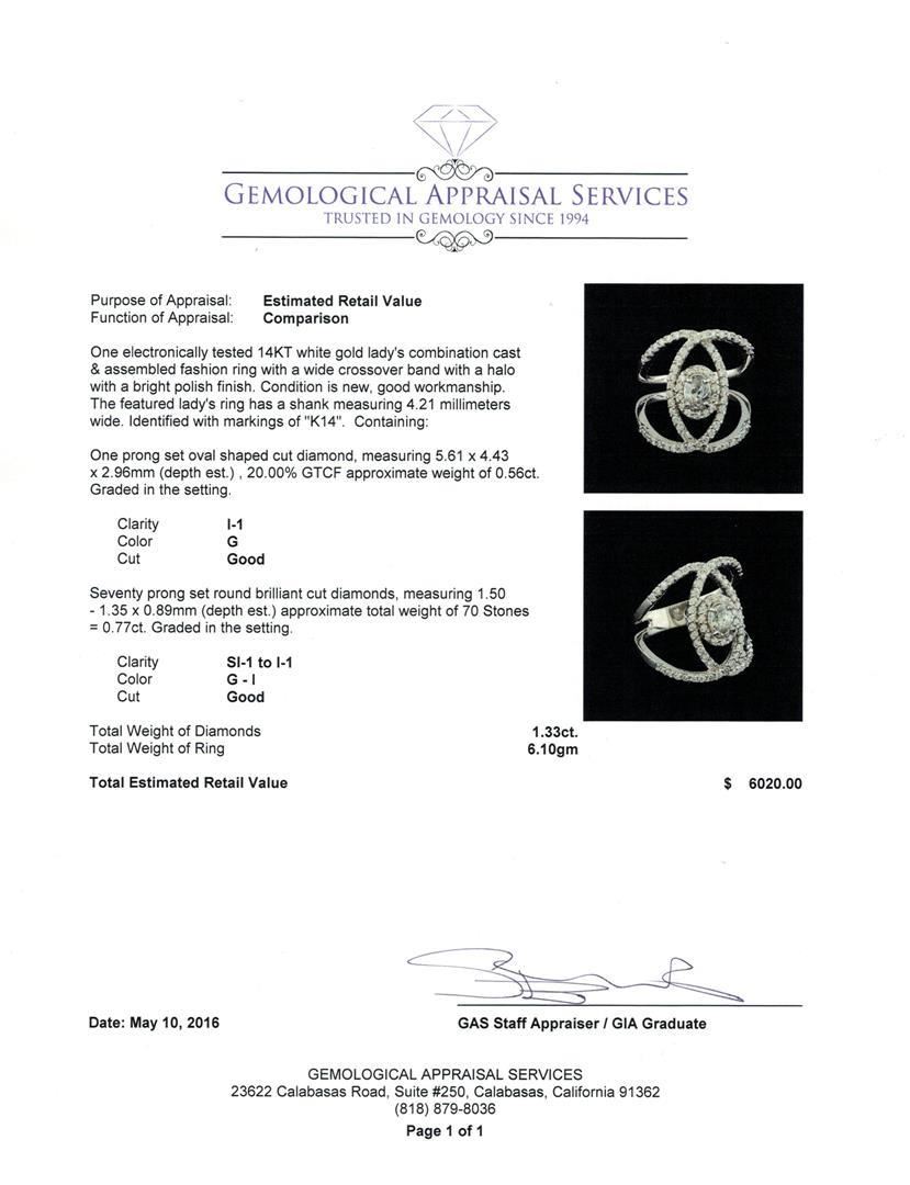 One electronically tested 14KT white gold lady's combination cast & assembled fashion ring with a wide crossover band with a halo with a bright polish finish. The featured lady's ring has a shank measuring 4.21 millimeters wide. Identified with markings of "K14". Condition is new, good workmanship. Containing: One prong set oval shaped cut diamond, measuring 5.61 x 4.43 x 2.96mm (depth est.) , 20.00.%. GTCF approximate weight of 0.56ct. Graded in the setting. Clarity: I-1. Color: G. Cut Good Seventy prong set round brilliant cut diamonds, measuring 1.50 - 1.35 x 0.89mm (depth est.) approximate total weight of 70 Stones = 0.77ct. Graded in the setting. Clarity: SI-1 to I-1. Color: G - I. Cut Good. Total Weight of Diamonds 1.33ct. Total Weight of Ring 6.10gm. GAS Appraised.