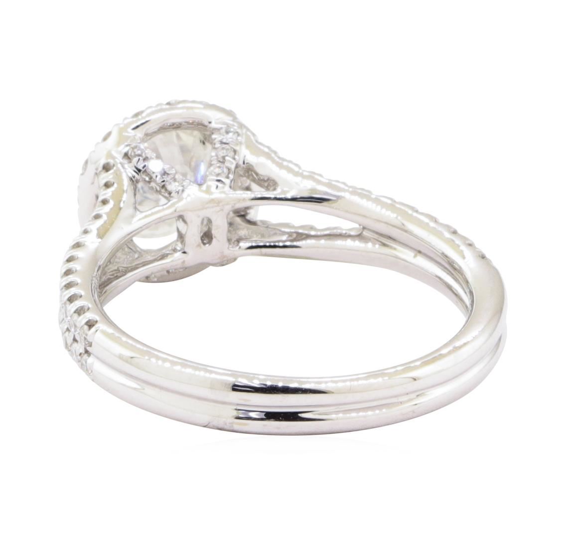 One electronically tested 18KT white gold ladies cast diamond unity ring with a bright polish finish. The featured diamond is set within a diamond bezel supported by diamond set split shoulders, completed by a grooved two and one-half millimeter wide band. Trademark is HANA. Identified with markings of "18K". Condition is new, good workmanship. Containing: One prong set round brilliant cut diamond, measuring 5.85 - 5.80 x 4.20mm (depth est.) approximate weight of 0.90ct with a faint orange fluorescence. Graded in the setting. Clarity I-1 Color I Depth 72.2% Table 61.9% Seventy-Six prong set round brilliant cut diamonds, measuring 1.20 - 1.10 x 0.69mm (depth est.) approximate total weight of 76 Stones = 0.43ct. Graded in the setting. Clarity VS-2 to SI-2 Color G - I Total Weight of Diamonds 1.33 ct. Estimated Retail Value $ 13,405.00 US