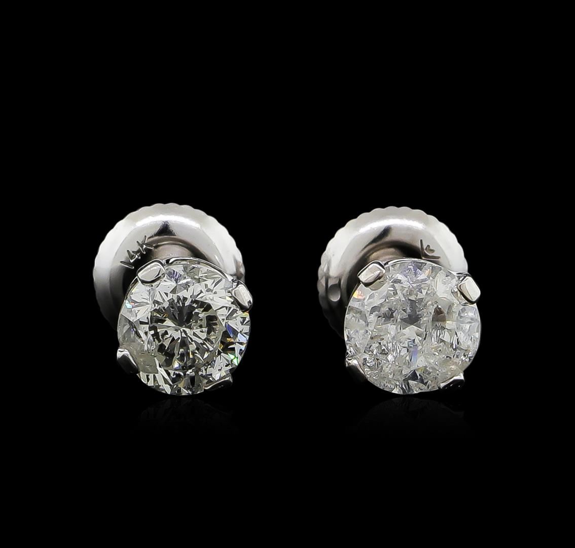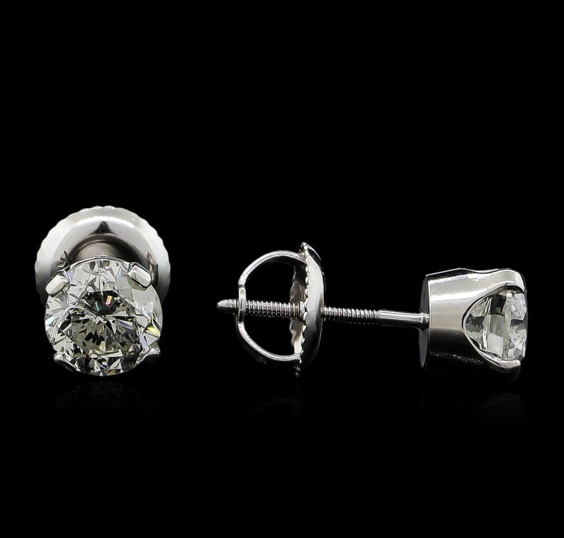 One pair electronically tested 14KT white gold cast & assembled diamond solitaire earrings with screw backs. Identified with markings of "14K". Condition is new, good workmanship. Containing: One prong set round brilliant cut diamond, measuring 5.50 - 5.40 x 3.44mm (depth est.), 3.00.%. GTCF approximate weight of 0.65ct. Graded in the setting. Clarity: I-2. Color: 63.1%. Table 61.5%. One prong set round brilliant cut diamond, measuring 5.70 - 5.65 x 3.40mm (depth est.), 4.00.%. GTCF approximate weight of 0.68ct. Graded in the setting. Clarity: I-2. Color: 59.9%. Table 61.1%. Total Weight of Diamonds 1.33ct. Total Weight of Earrings 1.31gm. AIG Appraised at $5,680.00.