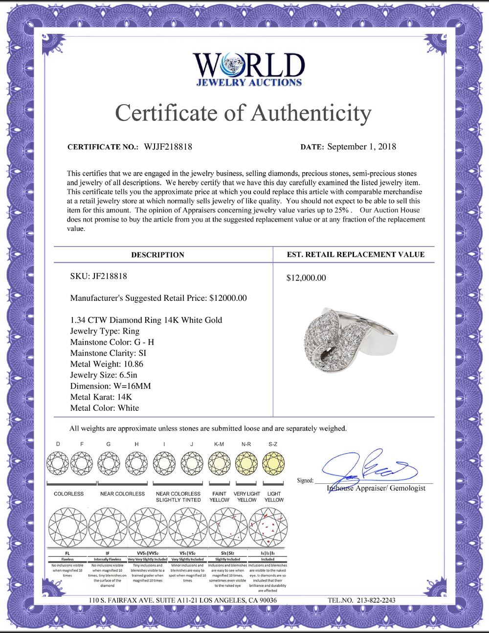 All property is sold “AS IS”, and ALL SALES ARE FINAL. Property is open to thorough public inspection. It is the Bidder’s responsibility to determine condition, age, genuineness, value or any other determinative factor. WJA may attempt to describe the merchandise in advertising and on the Internet but makes no representations. In no event shall WORLD JEWELRY AUCTION be held responsible for having made or implied any warranty of merchantability or fitness for a particular purpose. Bidder shall be the sole judge of value.