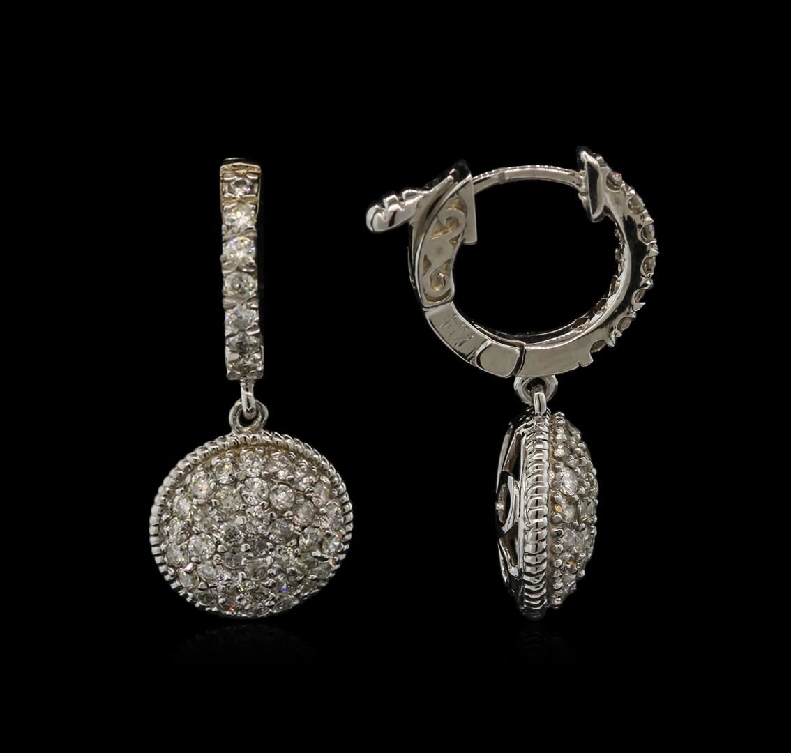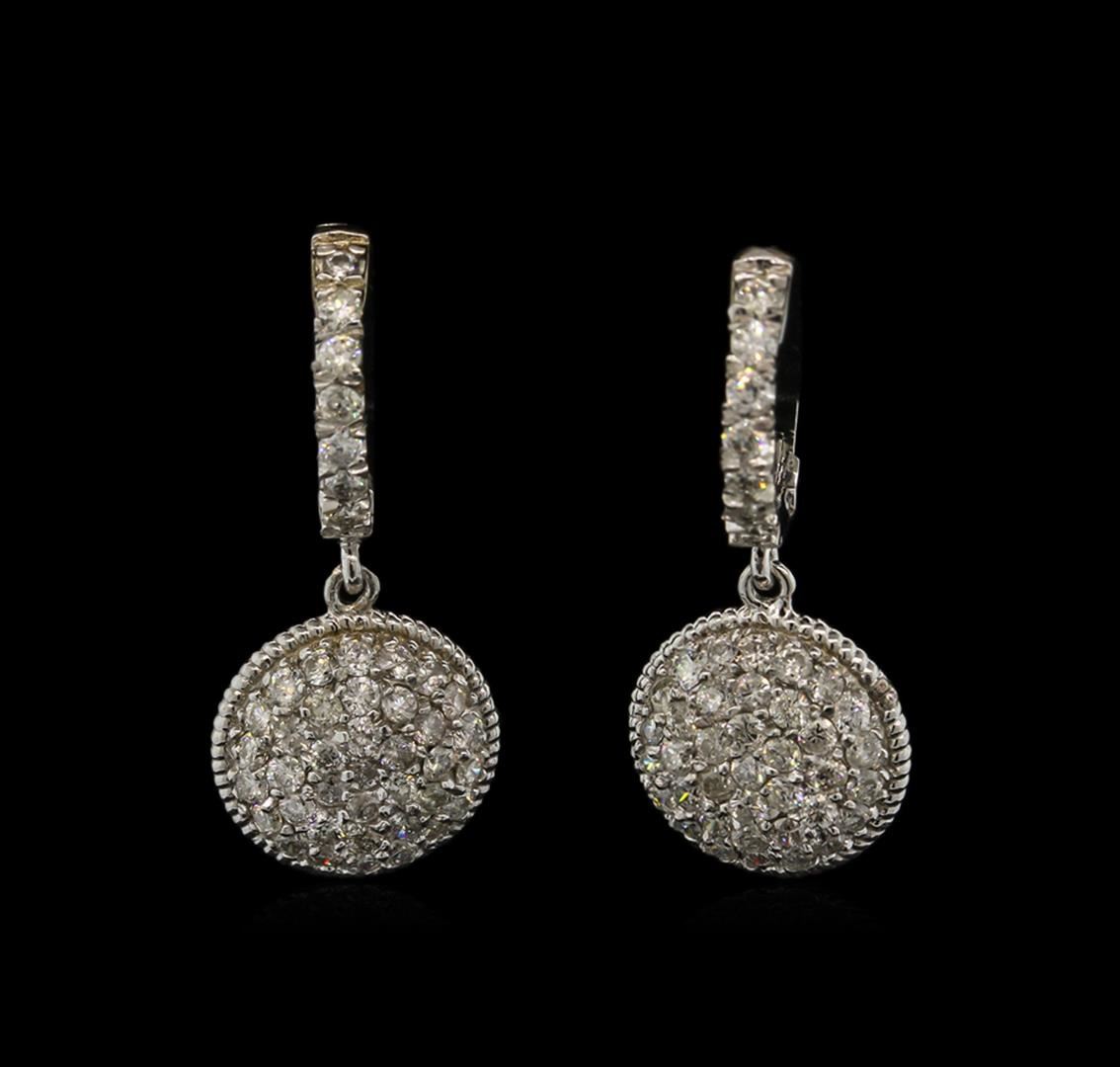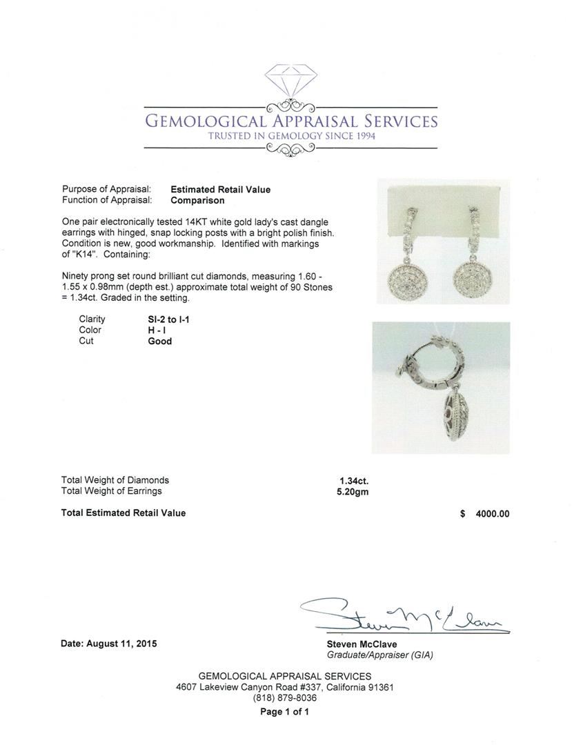 One pair electronically tested 14KT white gold lady's cast dangle earrings with hinged, snap locking posts with a bright polish finish. Identified with markings of "K14". Condition is new, good workmanship. Containing: Ninety prong set round brilliant cut diamonds, measuring 1.60 - 1.55 x 0.98mm (depth est.) approximate total weight of 90 Stones = 1.34ct. Graded in the setting. Clarity: SI-2 to I-1. Color: H - I. Cut Good. Total Weight of Diamonds 1.34ct. Total Weight of Earrings 5.20gm. GAS Appraised at $4,000.00.