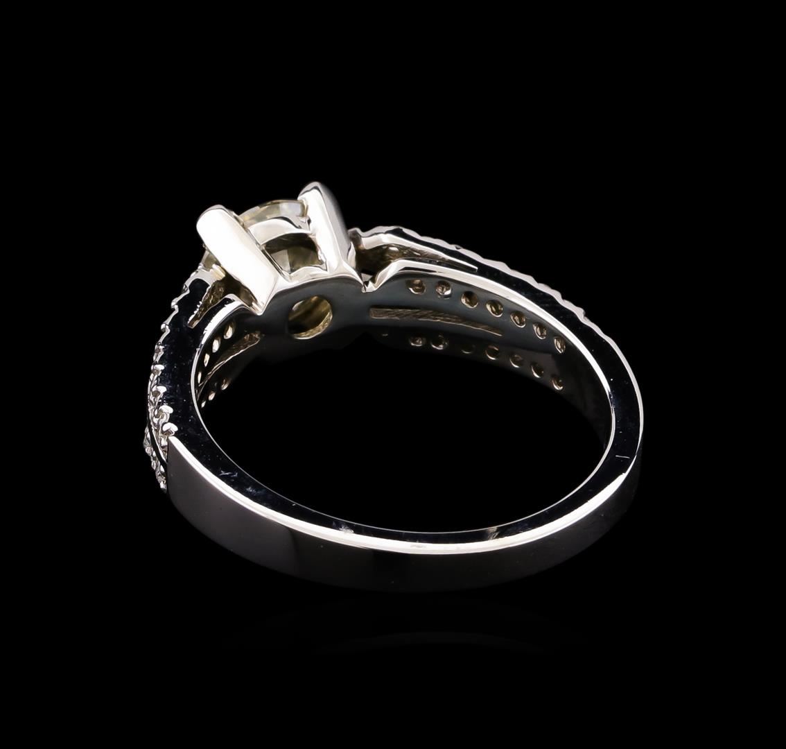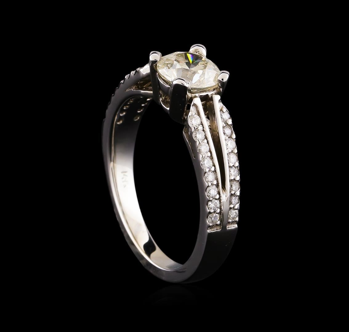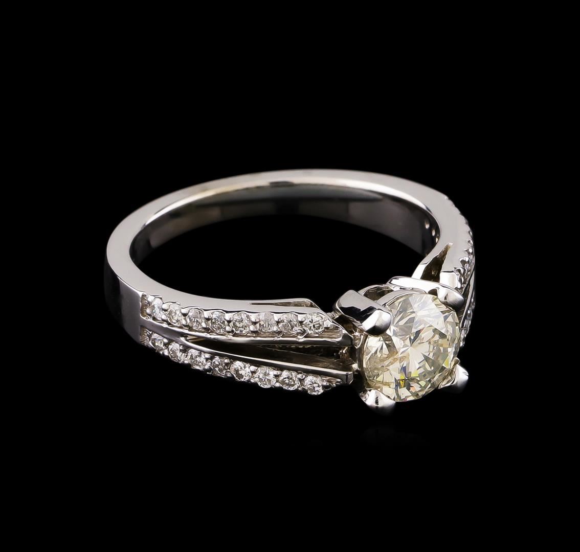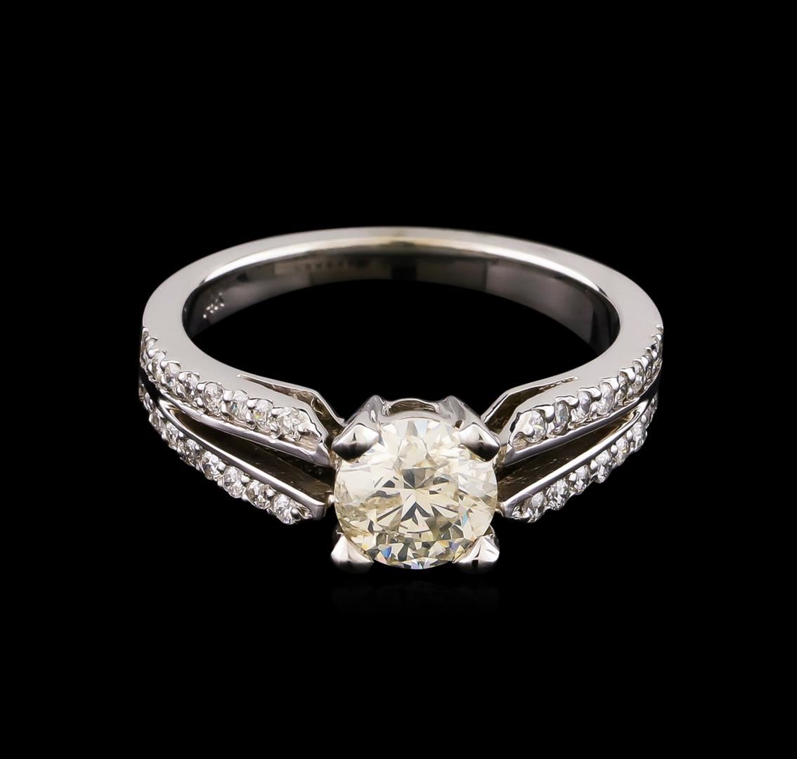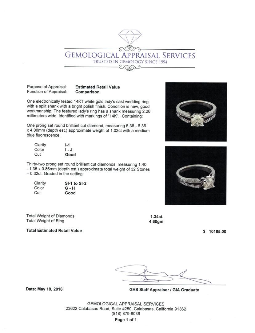 One electronically tested 14KT white gold lady's cast wedding ring with a split shank with a bright polish finish. The featured lady's ring has a shank measuring 2.26 millimeters wide. Identified with markings of "14K". Condition is new, good workmanship. Containing: One prong set round brilliant cut diamond, measuring 6.38 - 6.36 x 4.00mm (depth est.) approximate weight of 1.02ct with a medium blue fluorescence. Clarity: I-1. Color: I - Good Thirty-Two prong set round brilliant cut diamonds, measuring 1.40 - 1.35 x 0.86mm (depth est.) approximate total weight of 32 Stones = 0.32ct. Graded in the setting. Clarity: SI-1 to SI-2. Color: G - Good. Total Weight of Diamonds 1.34ct. Total Weight of Ring 4.60gm. GAS Appraised at $10,185.00.