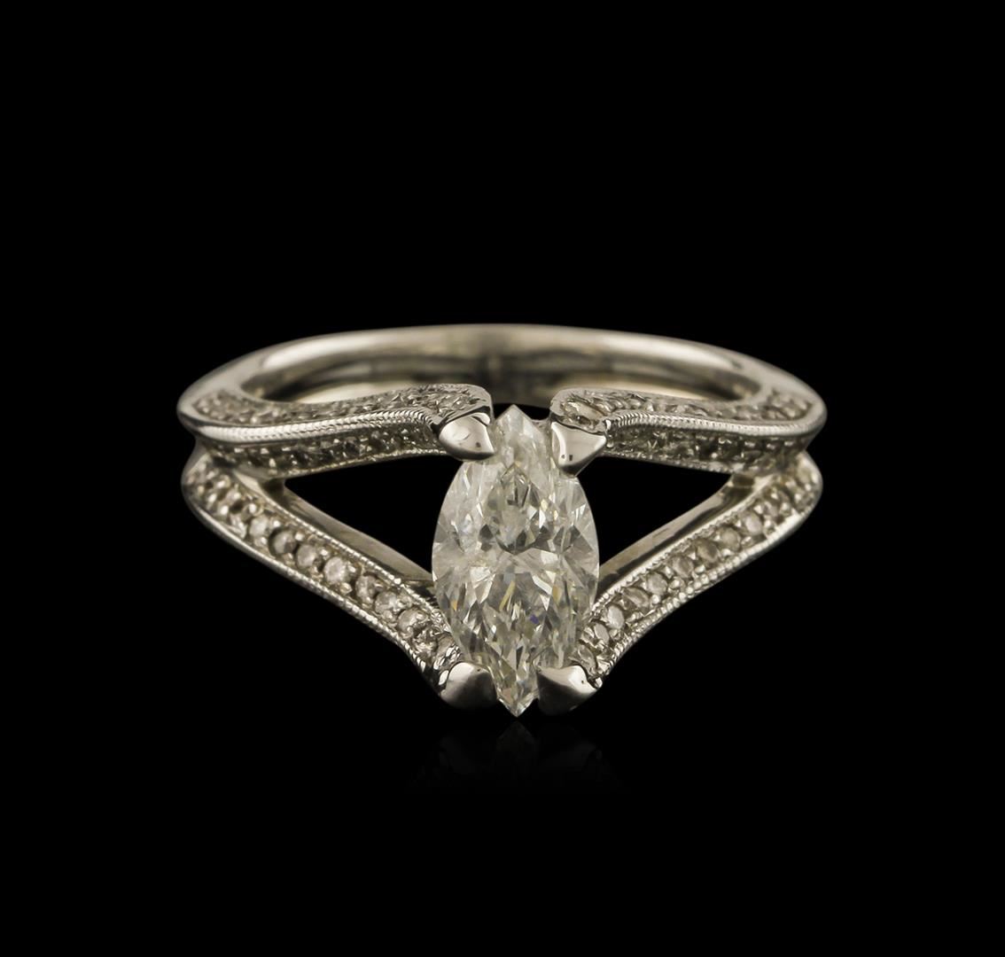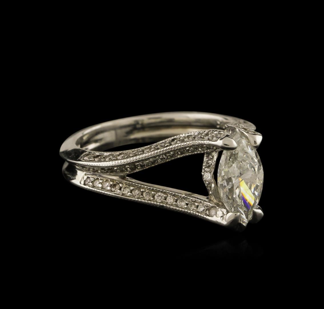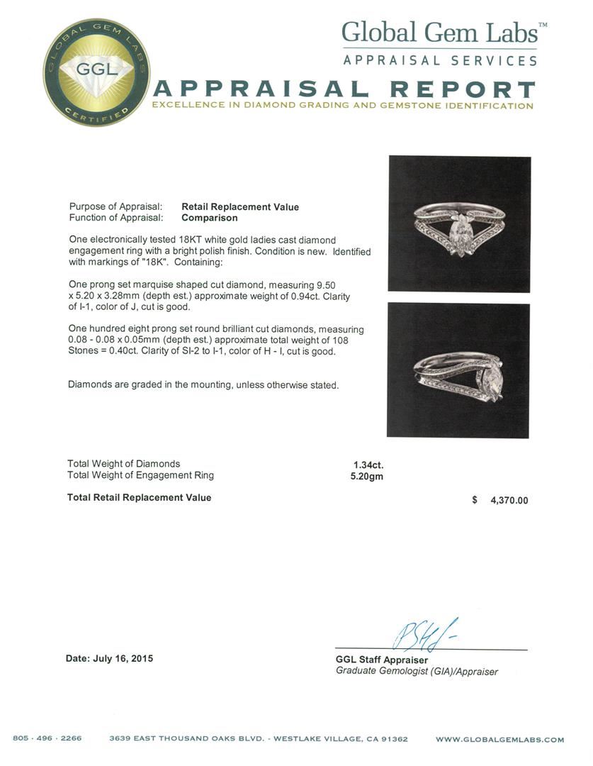 One electronically tested 18KT white gold ladies cast diamond engagement ring with a bright polish finish. Identified with markings of "18K". Condition is new. Containing: One prong set marquise shaped cut diamond, measuring 9.50 x 5.20 x 3.28mm (depth est.) approximate weight of 0.94ct. Clarity: I-1. Color: J, Cut is Good. One Hundred Eight prong set round brilliant cut diamonds, measuring 0.08 - 0.08 x 0.05mm (depth est.) approximate total weight of 108 Stones = 0.40ct. Clarity: SI-2 to I-1. Color: H - I, Cut is Good. Diamonds are graded in the mounting, unless otherwise stated. Total Weight of Diamonds 1.34ct. Total Weight of Engagement Ring 5.20 grams. GGL Appraised at $4,370.00.