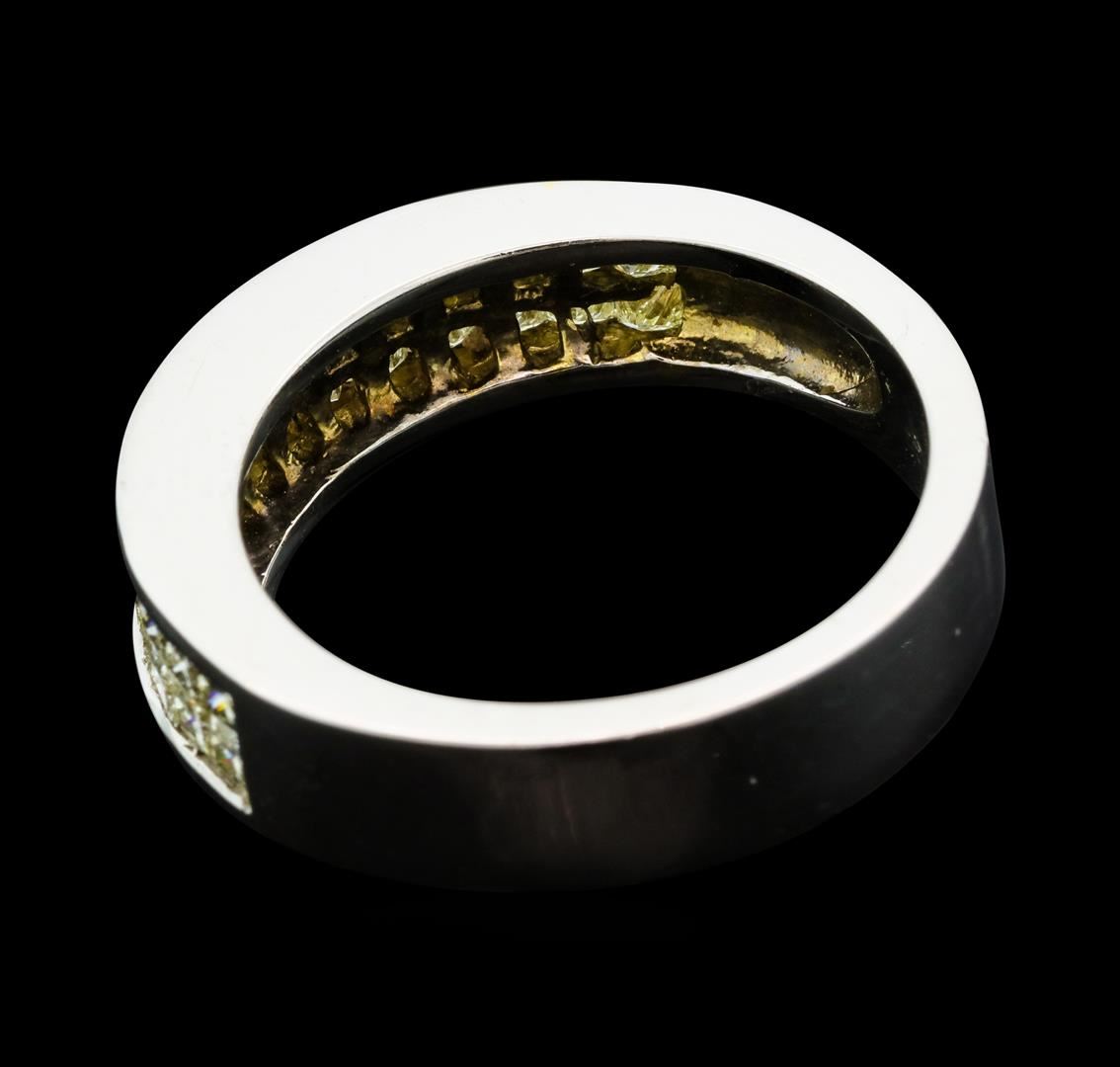 One electronically tested 18KT white gold man's cast wedding ring with a straight line motif with a bright polish finish. The featured man's ring has a shank measuring 5.68 millimeters wide. Identified with markings of '18K'. Condition is new, good workmanship. Containing: Thirty invisible set princess cut diamonds, measuring 2.00 x 1.90 x 1.43mm (depth est.) approximate total weight of 30 Stones = 1.34ct. Graded in the setting. Clarity VS-2 to SI-1. Color: J - K Cut Very Good. Total Weight of Diamonds 1.34ct.. Total Weight of Ring 10.30gm. GAS Appraised at $4,235.00.