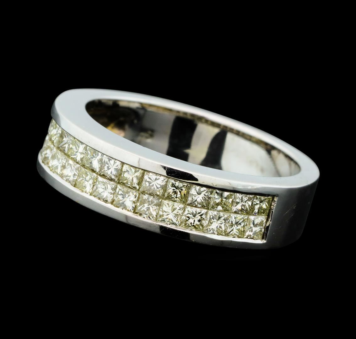 One electronically tested 18KT white gold man's cast wedding ring with a straight line motif with a bright polish finish. The featured man's ring has a shank measuring 5.68 millimeters wide. Identified with markings of '18K'. Condition is new, good workmanship. Containing: Thirty invisible set princess cut diamonds, measuring 2.00 x 1.90 x 1.43mm (depth est.) approximate total weight of 30 Stones = 1.34ct. Graded in the setting. Clarity VS-2 to SI-1. Color: J - K Cut Very Good. Total Weight of Diamonds 1.34ct.. Total Weight of Ring 10.30gm. GAS Appraised at $4,235.00.