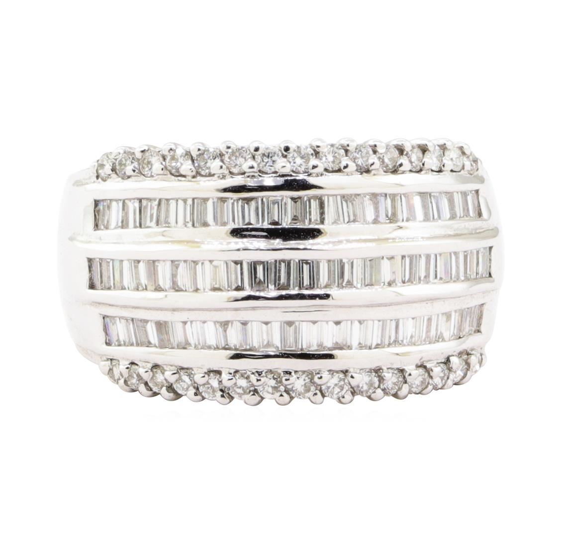 One electronically tested 18KT white gold lady's combination cast & assembled fashion ring with a five row wide band with a bright polish finish. The featured lady's ring has a shank measuring 5.30 millimeters wide. Identified with markings of '18K'. Condition is new, good workmanship. Containing: Sixty-Four channel set baguette cut diamonds, measuring from 1.60 x 1.05 x 0.89mm (depth est.) to 1.70 x 1.10 x 0.94mm (depth est.) approximate total weight of 64 Stones = 0.98ct. Graded in the setting. Color H - I Clarity VS-1 to VS-2 Cut Very Good Thirty prong set round brilliant cut diamonds, measuring 1.50 - 1.45 x 0.92mm (depth est.) approximate total weight of 30 Stones = 0.36ct. Graded in the setting. Color H - I Clarity SI-1 to SI-2 Cut Good. Total Weight of Diamonds 1.34ct.. Total Weight of Ring 10.10gm GAS Appraised at $4985.00. GAS Appraised.
