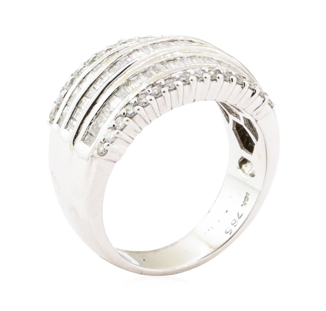 One electronically tested 18KT white gold lady's combination cast & assembled fashion ring with a five row wide band with a bright polish finish. The featured lady's ring has a shank measuring 5.30 millimeters wide. Identified with markings of '18K'. Condition is new, good workmanship. Containing: Sixty-Four channel set baguette cut diamonds, measuring from 1.60 x 1.05 x 0.89mm (depth est.) to 1.70 x 1.10 x 0.94mm (depth est.) approximate total weight of 64 Stones = 0.98ct. Graded in the setting. Color H - I Clarity VS-1 to VS-2 Cut Very Good Thirty prong set round brilliant cut diamonds, measuring 1.50 - 1.45 x 0.92mm (depth est.) approximate total weight of 30 Stones = 0.36ct. Graded in the setting. Color H - I Clarity SI-1 to SI-2 Cut Good. Total Weight of Diamonds 1.34ct.. Total Weight of Ring 10.10gm GAS Appraised at $4985.00. GAS Appraised.