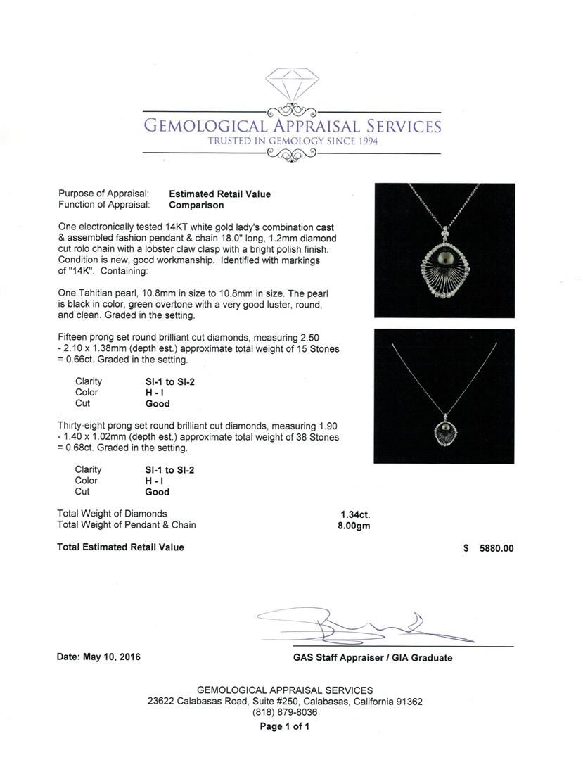One electronically tested 14KT white gold lady's combination cast & assembled fashion pendant & chain 18.0" long, 1.2mm diamond cut rolo chain with a lobster claw clasp with a bright polish finish. Identified with markings of "14K". Condition is new, good workmanship. Containing: One Tahitian pearl, 10.8mm in size to 10.8mm in size. The pearl is black in color, green overtone with a very good luster, round, and clean. Graded in the setting. Fifteen prong set round brilliant cut diamonds, measuring 2.50 - 2.10 x 1.38mm (depth est.) approximate total weight of 15 Stones = 0.66ct. Graded in the setting. Clarity: SI-1 to SI-2. Color: H - I. Cut Good Thirty-Eight prong set round brilliant cut diamonds, measuring 1.90 - 1.40 x 1.02mm (depth est.) approximate total weight of 38 Stones = 0.68ct. Graded in the setting. Clarity: SI-1 to SI-2. Color: H - I. Cut Good. Total Weight of Diamonds 1.34ct. Total Weight of Pendant & Chain 8.00gm. GAS Appraised at $5,880.00.
