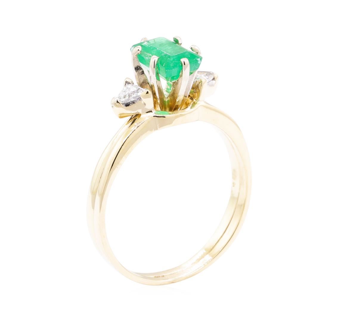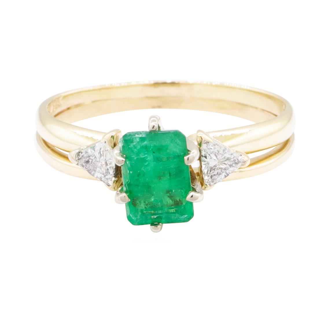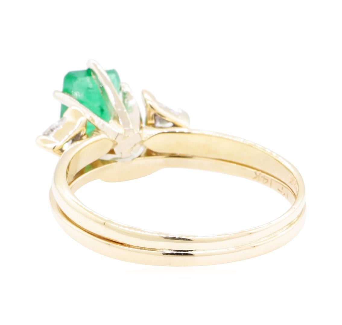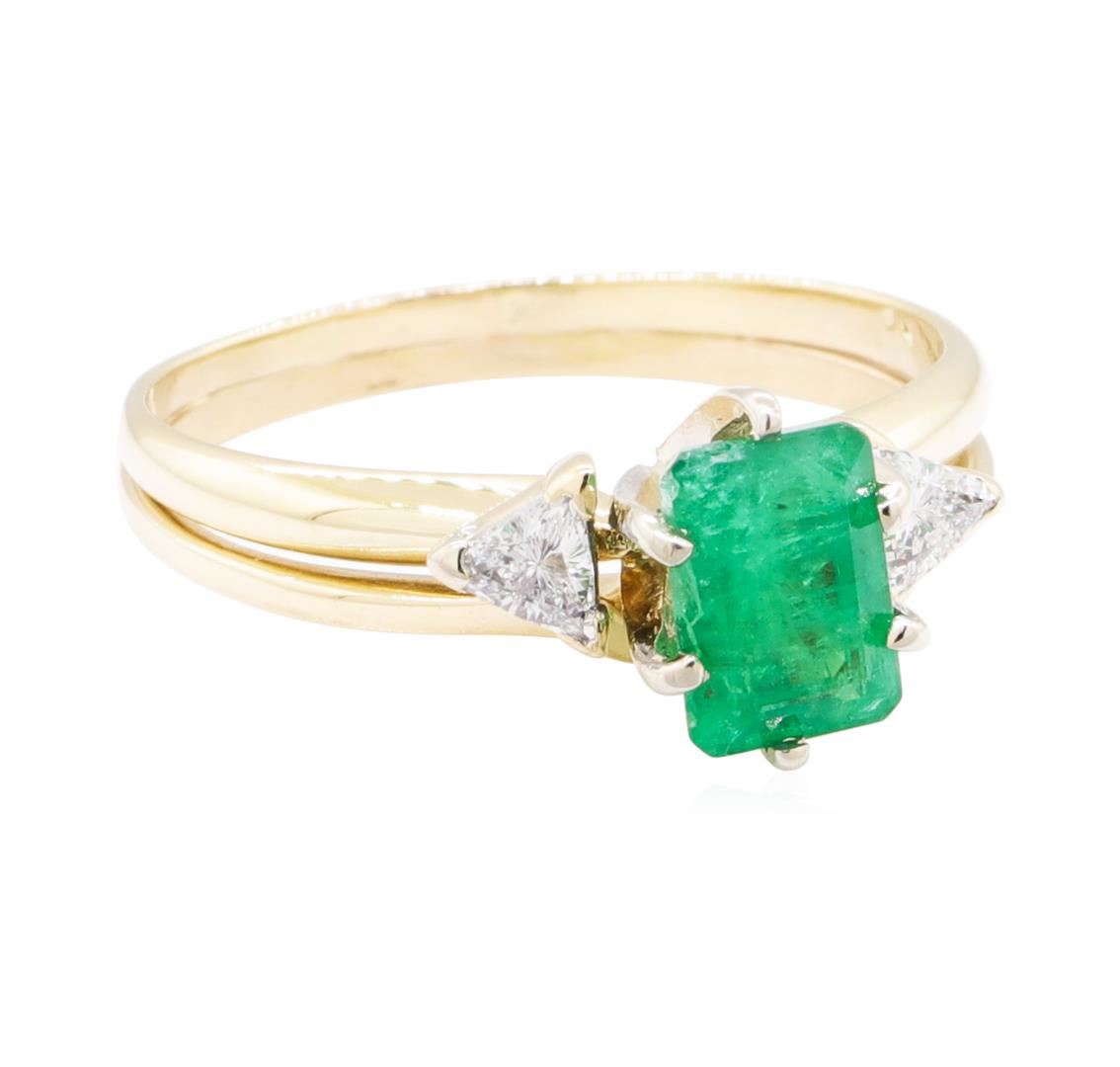 One set electronically tested 14KT yellow gold lady's combination cast & assembled fashion ring soldered to enhancer with a bright polish finish. The featured lady's ring has a double shank measuring 2.40 millimeters wide. Identified with markings of '14K'. Condition is new, good workmanship. Containing: One prong set emerald standard step cut natural emerald, measuring 7.07 x 4.90 x 3.70mm, (depth est.) 15%. bulge factor, approximate weight of 1.08ct., clarity is heavily included, medium, moderately strong, green color, (GIA G 5/4), cut is good. Transmitting light somewhat diffusely, semi-transparent to translucent. Naturally occurring internal & external characteristics are present. Indications of oil residue. Colored gemstones are presumed to have been subjected to commonly used enhancement processes. Graded in the setting. Two prong set triangle brilliant cut diamonds, measuring 3.60 x 3.20 x 1.98mm (depth est.) approximate total weight of 2 Stones = 0.26ct. Graded in the setting. Color F - G Clarity VS-2 to SI-1 Cut Very Good. Total Weight of Colored Stones 1.08ct.. Total Weight of Diamonds 0.26ct.. Total Weight of Ring Soldered To Enhancer 3.30gm GAS Appraised at $1760.00. GAS Appraised at $1,760.00.