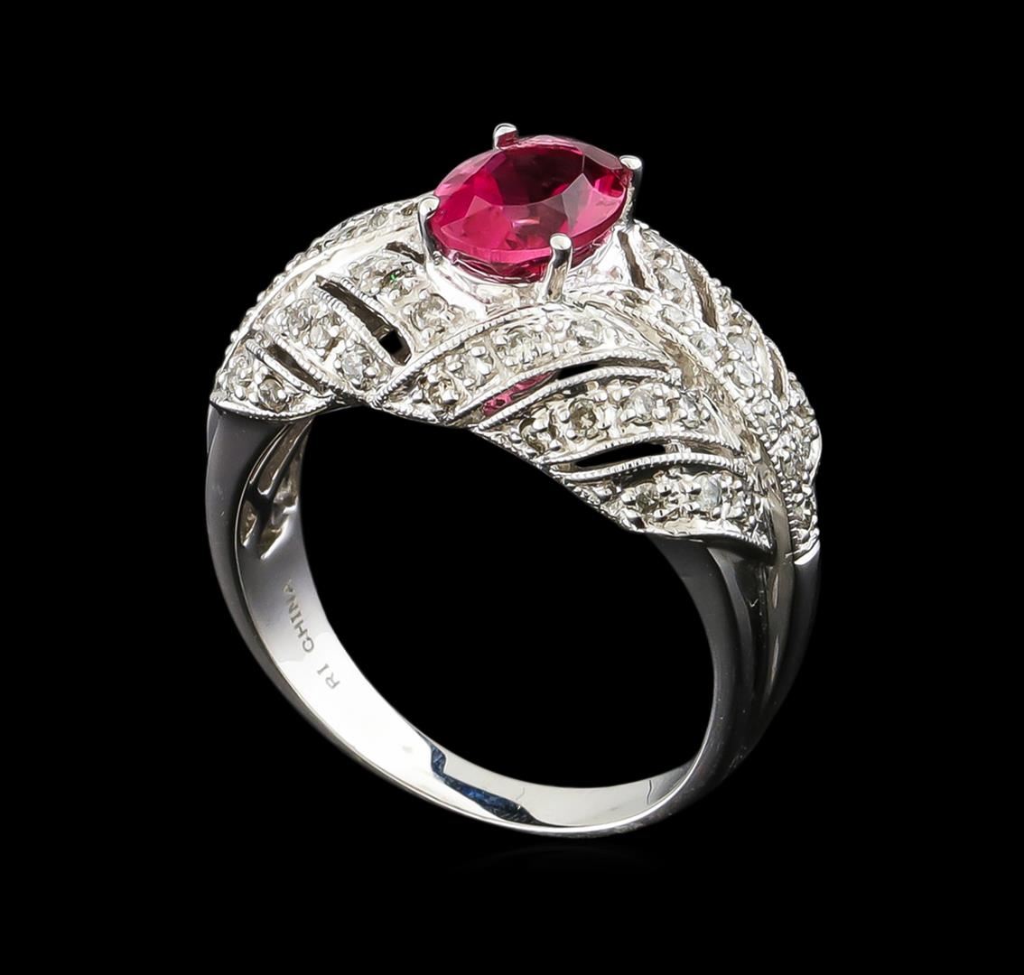 One electronically tested 10KT white gold ladies cast pink tourmaline and diamond ring. The featured pink tourmaline is set within an elaborate diamond set botanical gallery, completed by a two and one-half millimeter wide band. Bright polish finish with milgrain detailing throughout. Trademark is RI. Identified with markings of "10K". Condition is new, good workmanship. Containing: One prong set oval mixed cut natural pink tourmaline, measuring 7.95 x 5.90 x 4.10mm, approximate weight of 1.34ct., clarity is eye clean, type II, medium, very slightly brownish, slightly purplish red color, (GIA slpR 5/3), cut is good. Transmitting light with no distortion, transparent. Graded in the setting. This color of tourmaline is commonly irradiated to improve or change the color. Whether or not this gemstone has been irradiated cannot currently be determined. Fifty-Six prong set round brilliant cut diamonds, measuring 1.20 - 1.10 x 0.69mm (depth est.) approximate total weight of 56 Stones = 0.38ct. Graded in the setting. Clarity: I-1 to I-2. Color: H - J. Total Weight of Colored Stones 1.34ct. Total Weight of Diamonds 0.38ct. Total Weight of Ring 4.95gm. AIG Appraised at $2,130.00.