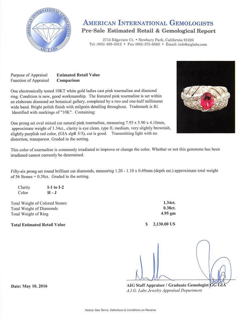 One electronically tested 10KT white gold ladies cast pink tourmaline and diamond ring. The featured pink tourmaline is set within an elaborate diamond set botanical gallery, completed by a two and one-half millimeter wide band. Bright polish finish with milgrain detailing throughout. Trademark is RI. Identified with markings of "10K". Condition is new, good workmanship. Containing: One prong set oval mixed cut natural pink tourmaline, measuring 7.95 x 5.90 x 4.10mm, approximate weight of 1.34ct., clarity is eye clean, type II, medium, very slightly brownish, slightly purplish red color, (GIA slpR 5/3), cut is good. Transmitting light with no distortion, transparent. Graded in the setting. This color of tourmaline is commonly irradiated to improve or change the color. Whether or not this gemstone has been irradiated cannot currently be determined. Fifty-Six prong set round brilliant cut diamonds, measuring 1.20 - 1.10 x 0.69mm (depth est.) approximate total weight of 56 Stones = 0.38ct. Graded in the setting. Clarity: I-1 to I-2. Color: H - J. Total Weight of Colored Stones 1.34ct. Total Weight of Diamonds 0.38ct. Total Weight of Ring 4.95gm. AIG Appraised at $2,130.00.