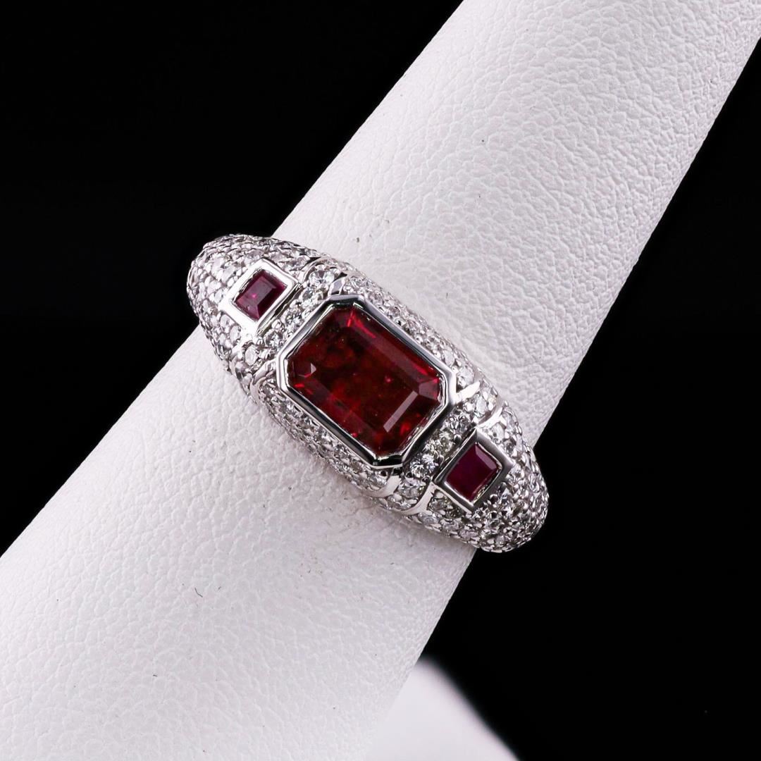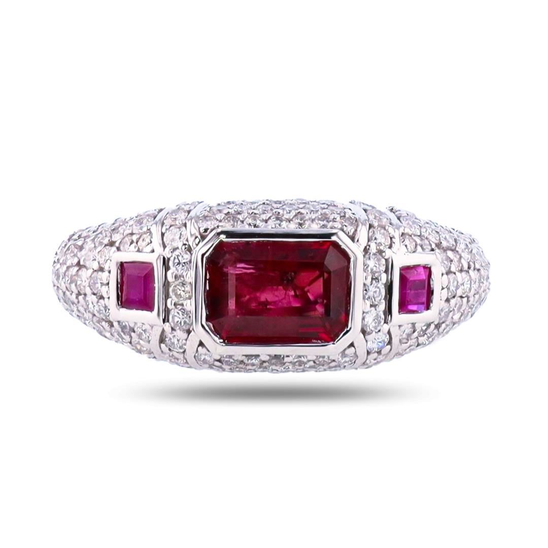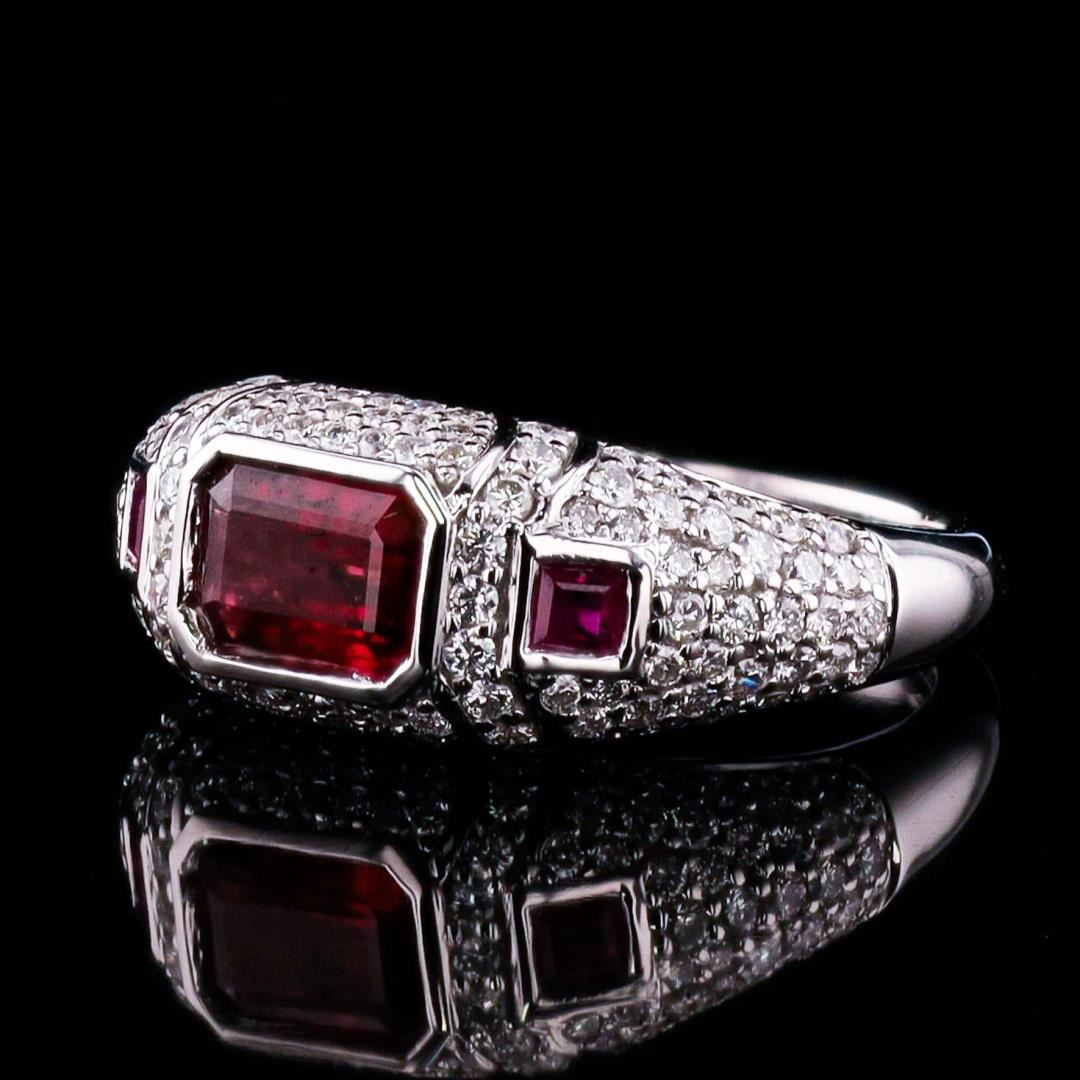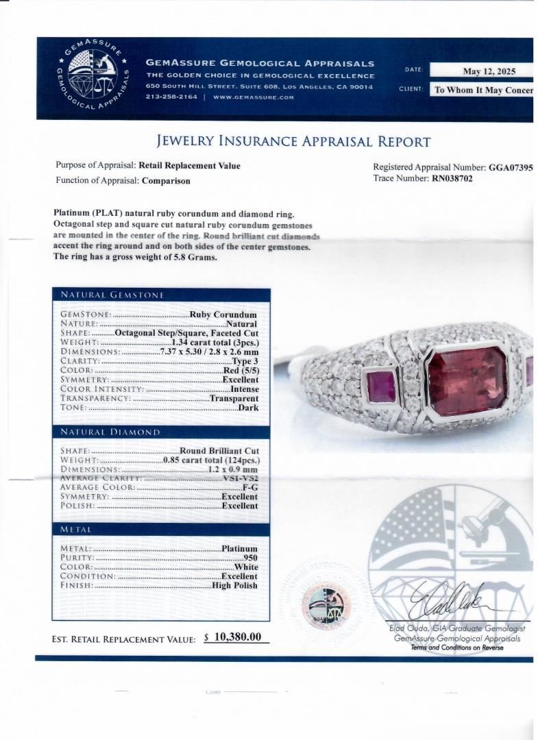 Platinum (PLAT) natural ruby corundum and diamond ring. Octagonal step and square cut natural ruby corundum gemstones are mounted in the center of the ring. Round brilliant cut diamonds accent the ring around and on both sides of the center gemstones. The ring has a gross weight of 5.8 Grams. #NATURAL GEMSTONE# GEMSTONE: Ruby Corundum; NATURE: Nature; SHAPE: Octagonal Step/Square, Faceted Cut; WEIGHT: 1.34 carat total (3pcs.); DIMENSIONS: 7.37 x 5.30 / 2.8 x 2.6mm; CLARITY: Type 3; COLOR: Red (5/5); SYMMETRY: Excellent; COLOR INTENSITY: Intense; TRANSPARENCY: Transparent; TONE: Dark #NATURAL DIAMOND# SHAPE: Round Brilliant Cut; WEIGHT: 0.85 carat total (124pcs.); DIMENSIONS: 1.2 x 0.9mm; AVERAGE CLARITY: VS1-VS2; AVERAGE COLOR: F-G; SYMMETRY: Excellent; POLISH: Excellent #METAL# METAL: Platinum; PURITY: 950; COLOR: White; CONDITION: Excellent; FINISH: High Polish #Size: 7