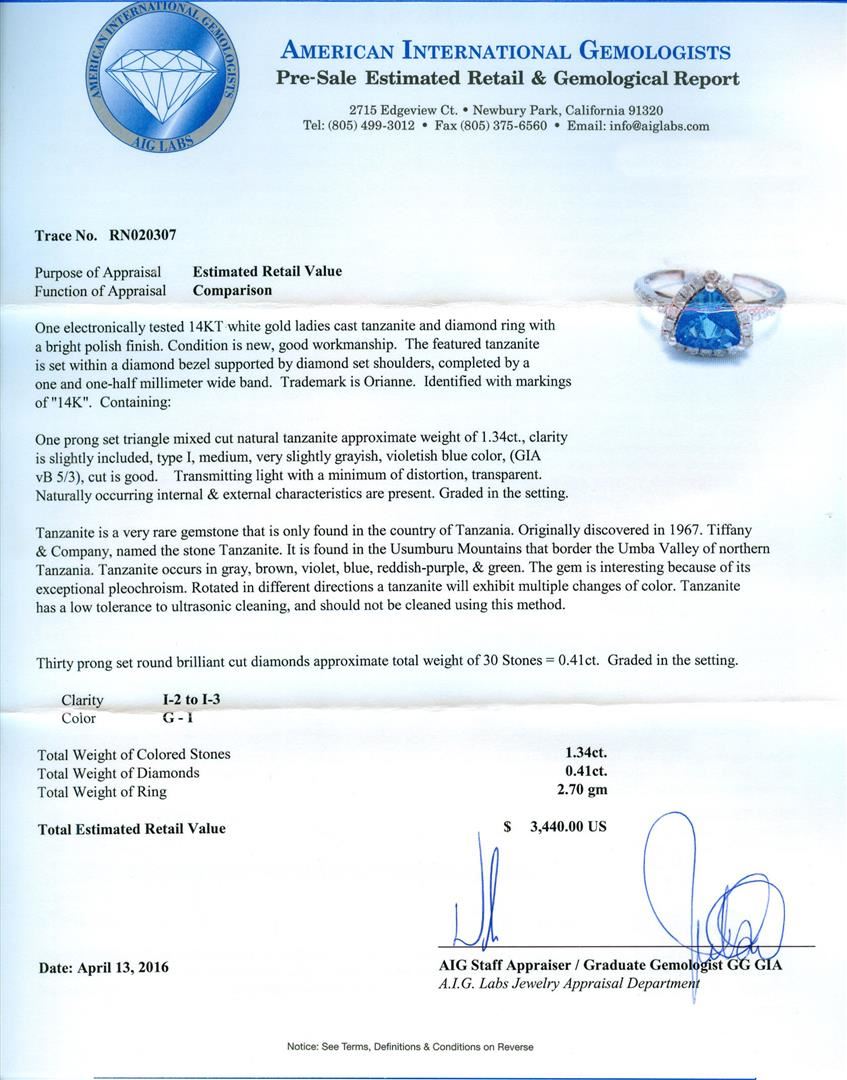 One electronically tested 14KT white gold ladies cast tanzanite and diamond ring with a bright polish finish. The featured tanzanite is set within a diamond bezel supported by diamond set shoulders, completed by a one and one-half millimeter wide band. Trademark is Orianne. Identified with markings of "14K". Condition is new, good workmanship. Containing: One prong set triangle mixed cut natural tanzanite approximate weight of 1.34ct., clarity is slightly included, type I, medium, very slightly grayish, violetish blue color, (GIA vB 5/3), cut is good. Transmitting light with a minimum of distortion, transparent. Naturally occurring internal & external characteristics are present. Graded in the setting. Tanzanite is a very rare gemstone that is only found in the country of Tanzania. Originally discovered in 1967. Tiffany & Company, named the stone Tanzanite. It is found in the Usumburu Mountains that border the Umba Valley of northern Tanzania. Tanzanite occurs in gray, brown, violet, blue, reddish-purple, & green. The gem is interesting because of its exceptional pleochroism. Rotated in different directions a tanzanite will exhibit multiple changes of color. Tanzanite has a low tolerance to ultrasonic cleaning, and should not be cleaned using this method. Thirty prong set round brilliant cut diamonds approximate total weight of 30 Stones = 0.41ct. Graded in the setting. Clarity: I-2 to I-3. Color: G - I. Total Weight of Colored Stones 1.34ct. Total Weight of Diamonds 0.41ct. Total Weight of Ring 2.70gm. AIG Appraised at $3,440.00.
