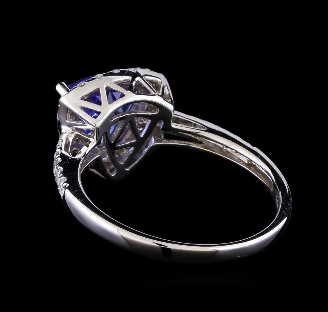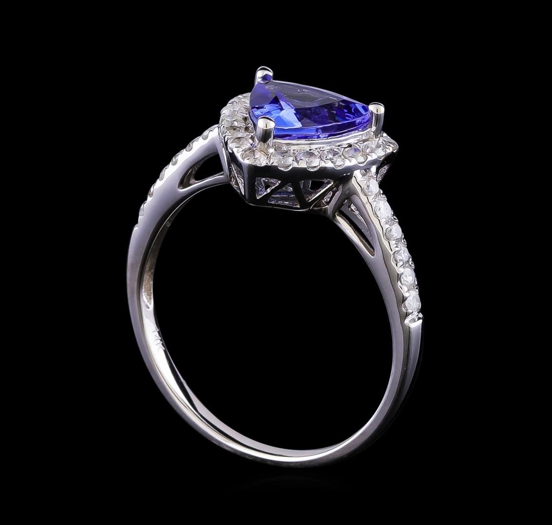 One electronically tested 14KT white gold ladies cast tanzanite and diamond ring with a bright polish finish. The featured tanzanite is set within a diamond bezel supported by diamond set shoulders, completed by a one and one-half millimeter wide band. Trademark is Orianne. Identified with markings of "14K". Condition is new, good workmanship. Containing: One prong set triangle mixed cut natural tanzanite approximate weight of 1.34ct., clarity is slightly included, type I, medium, very slightly grayish, violetish blue color, (GIA vB 5/3), cut is good. Transmitting light with a minimum of distortion, transparent. Naturally occurring internal & external characteristics are present. Graded in the setting. Tanzanite is a very rare gemstone that is only found in the country of Tanzania. Originally discovered in 1967. Tiffany & Company, named the stone Tanzanite. It is found in the Usumburu Mountains that border the Umba Valley of northern Tanzania. Tanzanite occurs in gray, brown, violet, blue, reddish-purple, & green. The gem is interesting because of its exceptional pleochroism. Rotated in different directions a tanzanite will exhibit multiple changes of color. Tanzanite has a low tolerance to ultrasonic cleaning, and should not be cleaned using this method. Thirty prong set round brilliant cut diamonds approximate total weight of 30 Stones = 0.41ct. Graded in the setting. Clarity: I-2 to I-3. Color: G - I. Total Weight of Colored Stones 1.34ct. Total Weight of Diamonds 0.41ct. Total Weight of Ring 2.70gm. AIG Appraised at $3,440.00.