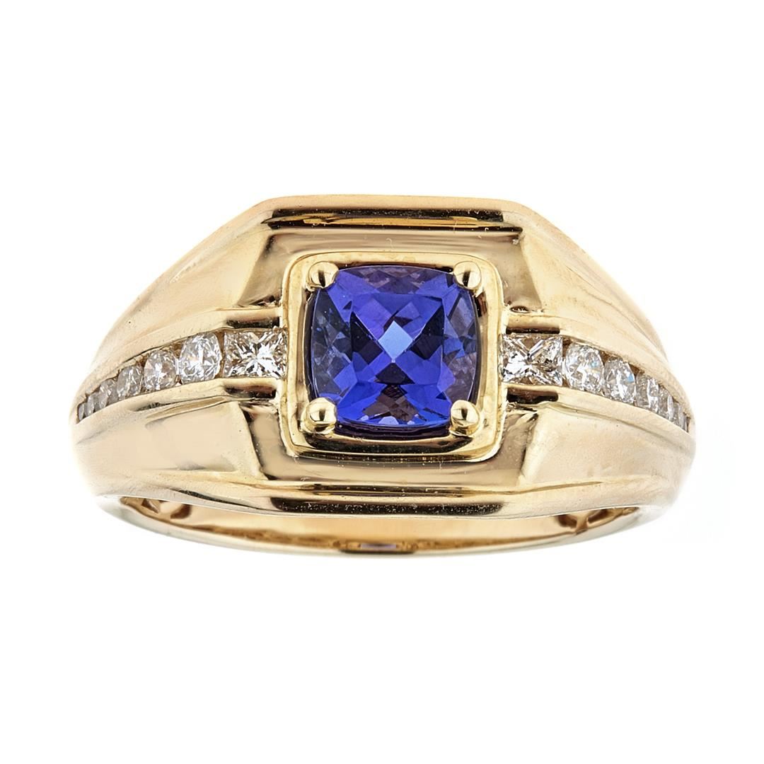 One Tanzanite and Diamond Ring. Setting: 14 Kt. Yellow Gold Mounting. Additional: 12 Round Diamonds and 2 Princess Cut Diamonds = 0.55 Cts. TWT ( G-H/VS-SI). Center Gem Stone Information: Species: Natural Zoisite. Variety: Tanzanite. Shape and Cut: Cushion Mixed Cut. Measurements: 6.50 x 6.47 x 4.95 mm. Weight: 1.34 Carats. Transparency: Transparent. Color Hue: Violetish Blue. Saturation: Moderate. Total Weight: 8.4 grams.