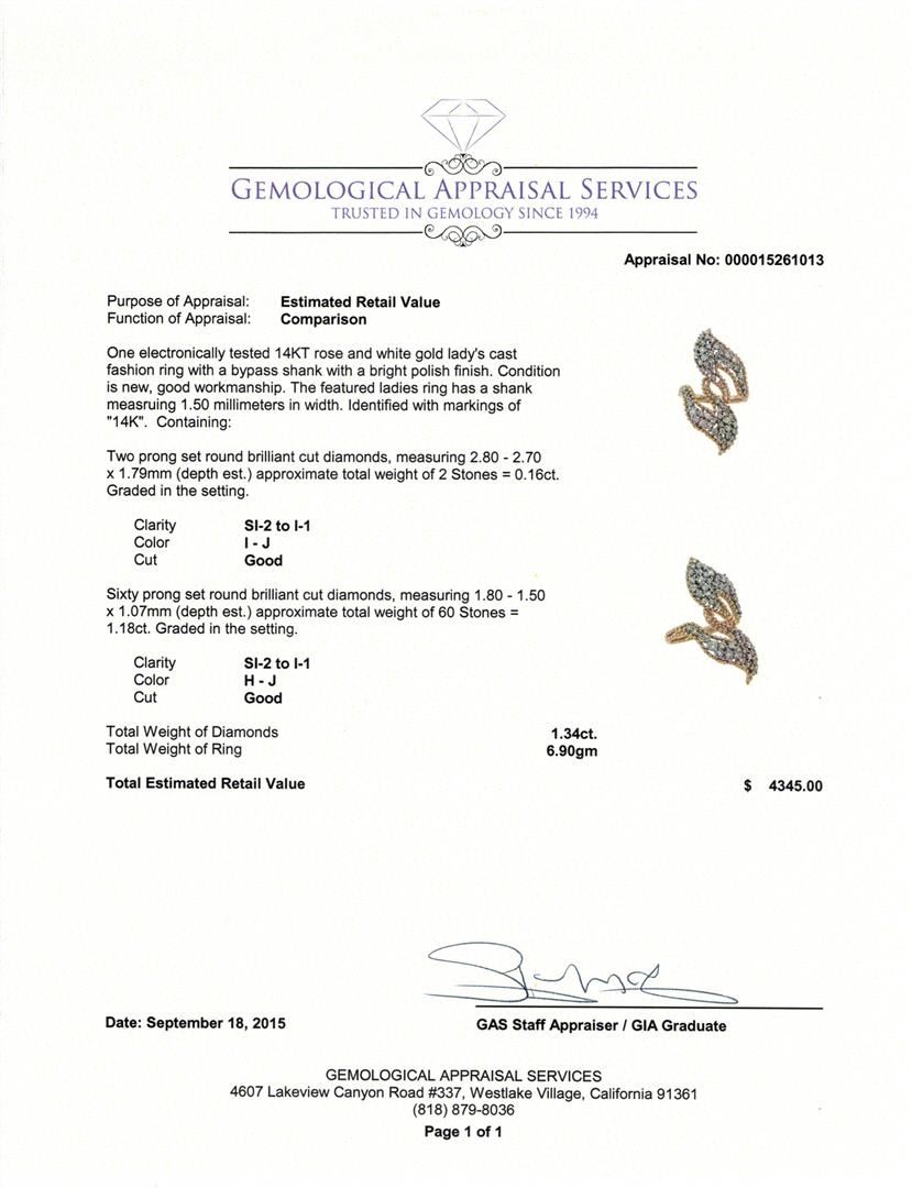 One electronically tested 14KT rose and white gold lady's cast fashion ring with a bypass shank with a bright polish finish. The featured ladies ring has a shank measuring 1.50 millimeters in width. Identified with markings of "14K". Condition is new, good workmanship. Containing: Two prong set round brilliant cut diamonds, measuring 2.80 - 2.70 x 1.79mm (depth est.) approximate total weight of 2 Stones = 0.16ct. Graded in the setting. Clarity: SI-2 to I-1. Color: I - Good Sixty prong set round brilliant cut diamonds, measuring 1.80 - 1.50 x 1.07mm (depth est.) approximate total weight of 60 Stones = 1.18ct. Graded in the setting. Clarity: SI-2 to I-1. Color: H - Good. Total Weight of Diamonds 1.34ct. Total Weight of Ring 6.90gm. GAS Appraised at $4,345.00.