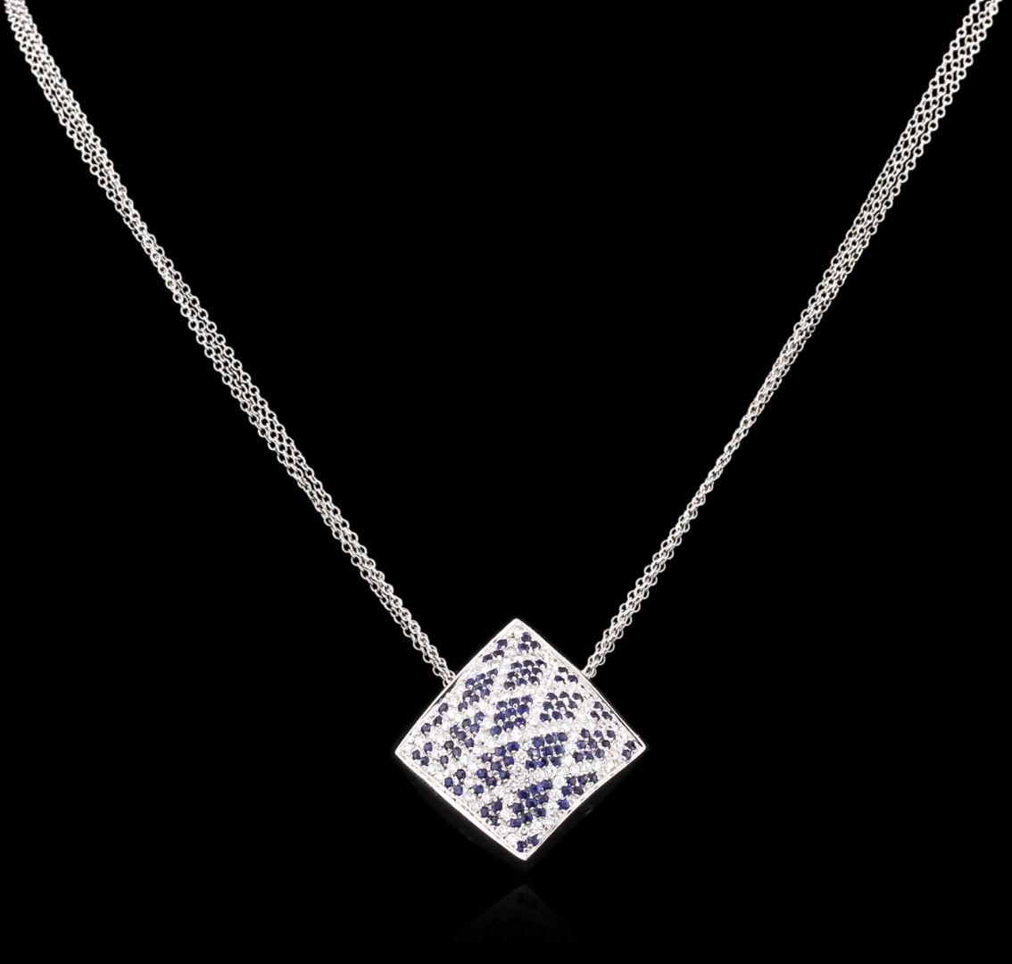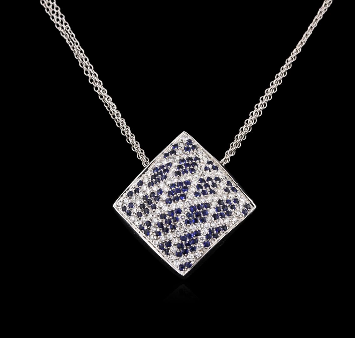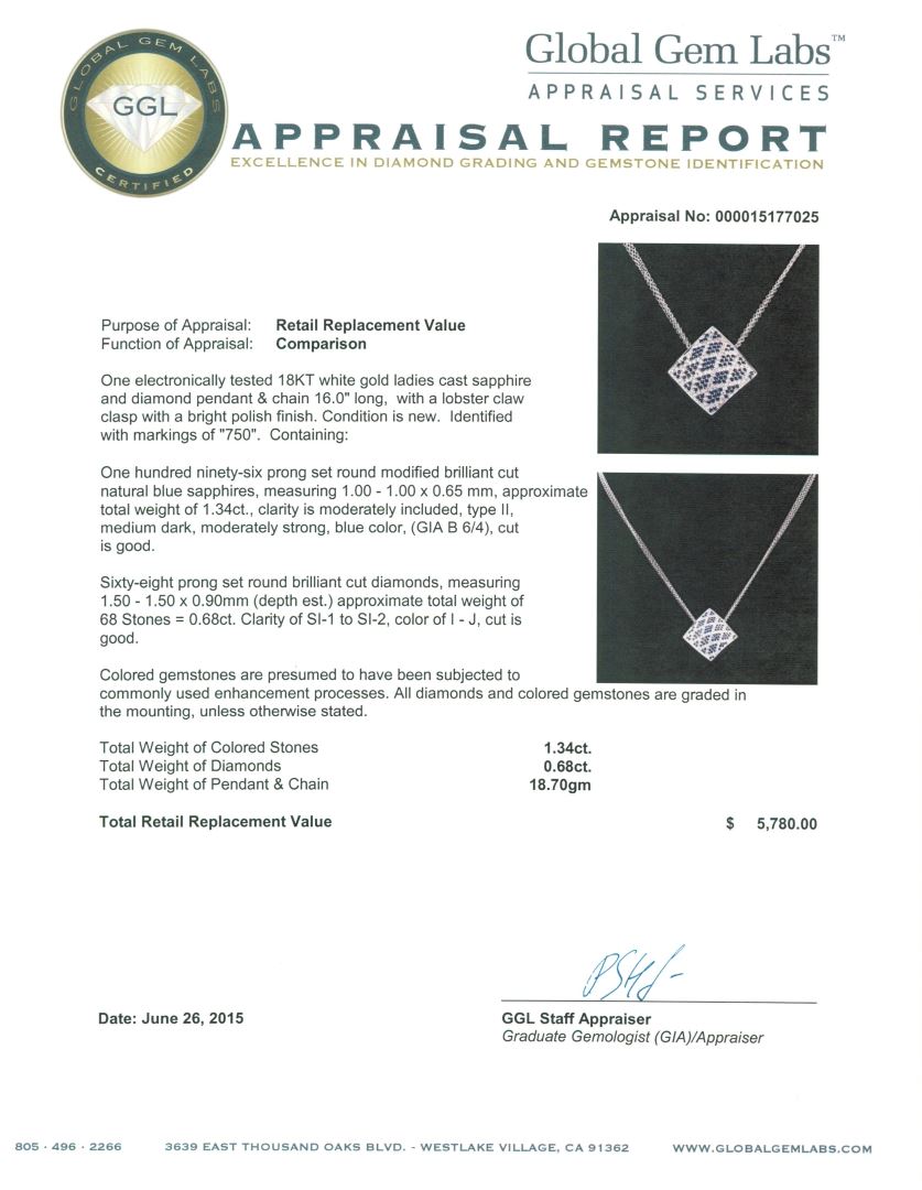 One electronically tested 18KT white gold ladies cast sapphire and diamond pendant & chain 16.0" long, with a lobster claw clasp with a bright polish finish. Identified with markings of "750". Condition is new. Containing: One hundred ninety-six prong set round modified brilliant cut natural blue sapphires, measuring 1.00 - 1.00 x 0.65 mm, approximate total weight of 1.34ct., clarity is moderately included, type II, medium dark, moderately strong, blue color, (GIA B 6/4), cut is good. Sixty-Eight prong set round brilliant cut diamonds, measuring 1.50 - 1.50 x 0.90mm (depth est.) approximate total weight of 68 Stones = 0.68ct. Clarity: SI-1 to SI-2. Color: I - J, Cut is Good. Colored gemstones are presumed to have been subjected to commonly used enhancement processes. All diamonds and colored gemstones are graded in the mounting, unless otherwise stated. Total Weight of Colored Stones 1.34ct. Total Weight of Diamonds 0.68ct. Total Weight of Pendant & Chain 18.70 grams. GGL Appraised at $5,780.00.