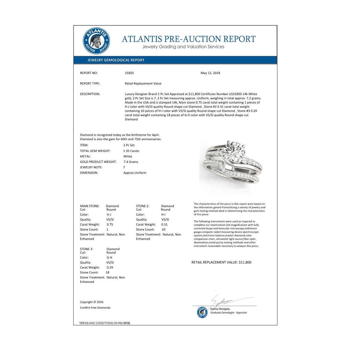 REF-214A8X -31850 ---- 1.35 CTW Certified VS/SI Diamond Bypass Solitaire 2Pc Wedding Set 14K White Gold ---- Luxury Designer Brand 2 Pc Set Appraised at $11,800 Certificate Number US31850 14k White gold, 2 Pc Set Size is 7, 2 Pc Set measuring approx. Uniform, weighing in total approx. 7.2 grams. Made in the USA and is stamped 14k, Main stone 0.75 carat total weight containing 1 pieces of H-J color with VS/SI quality Round shape cut Diamond , Stone #2 0.31 carat total weight containing 10 pieces of H-I color with VS/SI quality Round shape cut Diamond , Stone #3 0.29 carat total weight containing 18 pieces of G-H color with VS/SI quality Round shape cut Diamond
