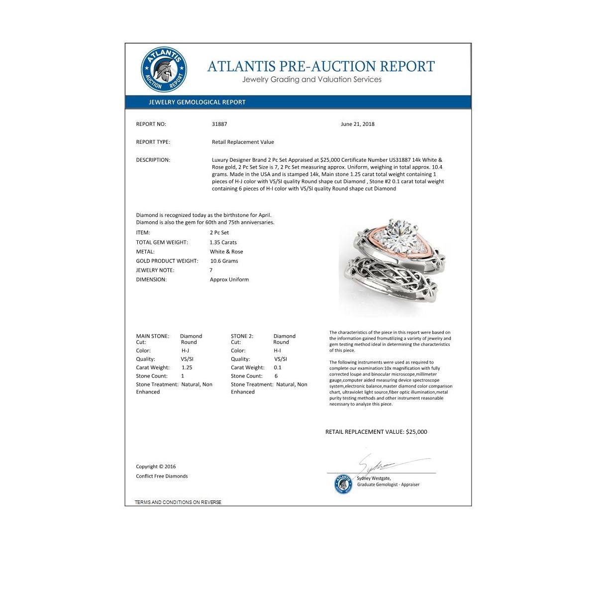 REF-505T5M -31887 ---- 1.35 CTW Certified VS/SI Diamond Solitaire 2Pc Set 14K White & Rose Gold ---- Luxury Designer Brand 2 Pc Set Appraised at $25,000 Certificate Number US31887 14k White & Rose gold, 2 Pc Set Size is 7, 2 Pc Set measuring approx. Uniform, weighing in total approx. 10.4 grams. Made in the USA and is stamped 14k, Main stone 1.25 carat total weight containing 1 pieces of H-J color with VS/SI quality Round shape cut Diamond , Stone #2 0.1 carat total weight containing 6 pieces of H-I color with VS/SI quality Round shape cut Diamond