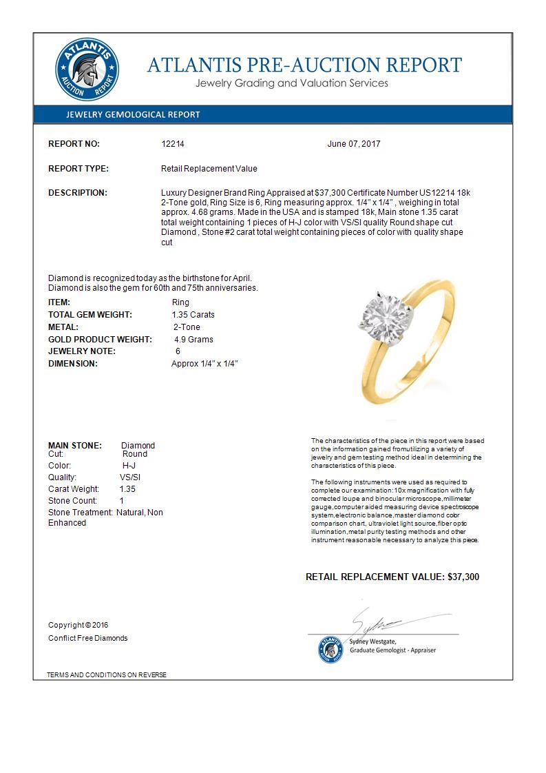 1.35 CTW Certified VS/SI Diamond Solitaire Ring 18K 2-Tone Gold ---- Luxury Designer Brand Ring Appraised Retail Price at $37,300 ---- SKU Number US12214 18k 2-Tone gold Ring Size is 6, Ring measuring approx. 1/4" x 1/4" , weighing in total approx. 4.68 grams. Made in the USA and is stamped 18k, Main stone 1.35 carat total weight containing 1 pieces of H-J color with VS/SI quality Round shape cut Diamond , Stone #2 carat total weight containing pieces of color with quality shape cut