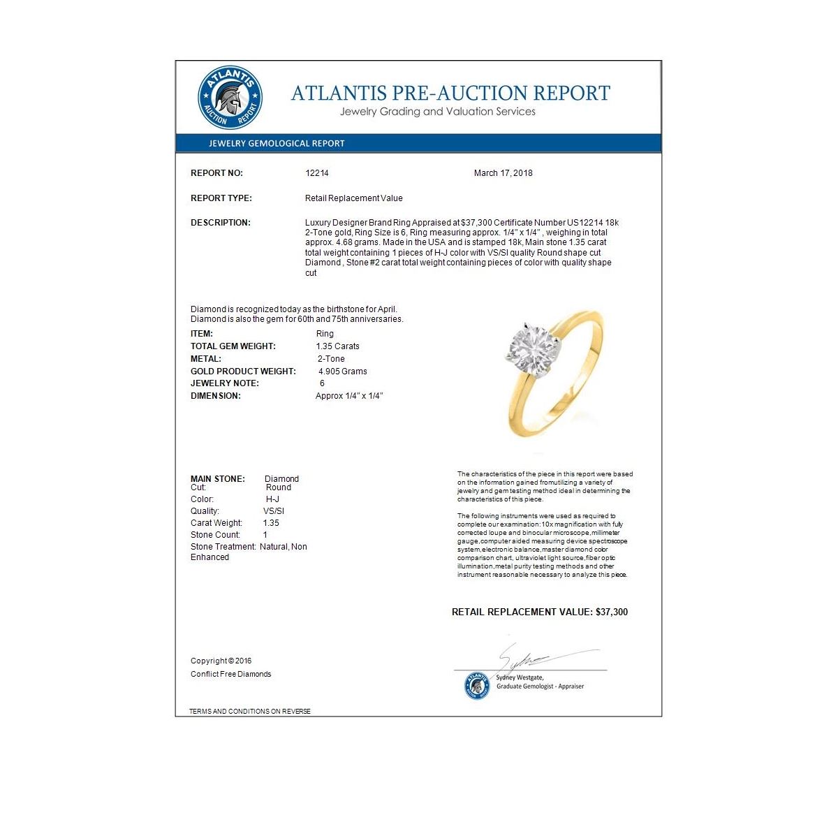 REF-699K5W -12214 ---- 1.35 CTW Certified VS/SI Diamond Solitaire Ring 18K 2-Tone Gold ---- Luxury Designer Brand Ring Appraised at $37,300 Certificate Number US12214 18k 2-Tone gold, Ring Size is 6, Ring measuring approx. 1/4" x 1/4" , weighing in total approx. 4.68 grams. Made in the USA and is stamped 18k, Main stone 1.35 carat total weight containing 1 pieces of H-J color with VS/SI quality Round shape cut Diamond , Stone #2 carat total weight containing pieces of color with quality shape cut