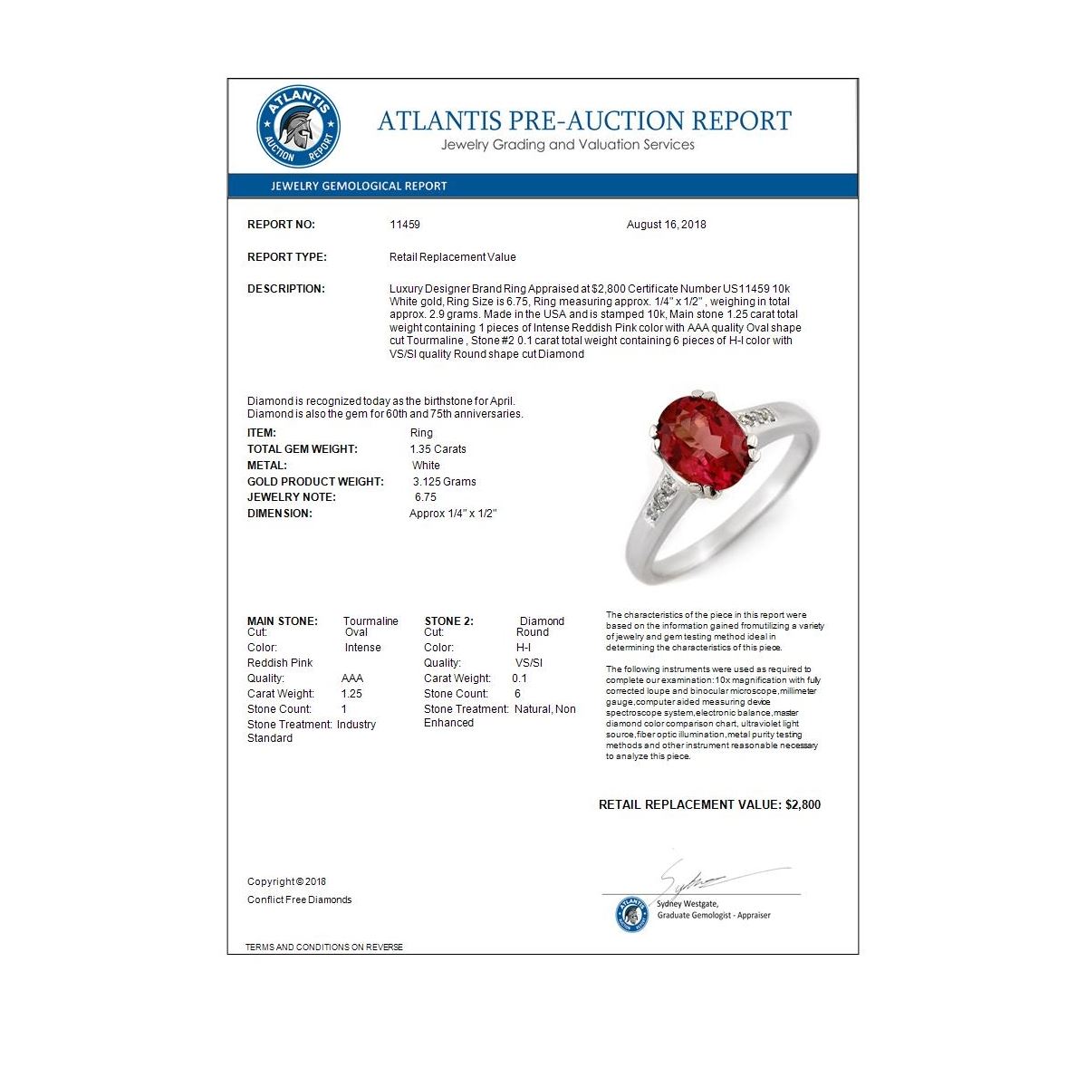 REF-36H4A -11459 ---- 1.35 CTW Pink Tourmaline & Diamond Ring 10K White Gold ---- Luxury Designer Brand Ring Appraised at $2,800 Certificate Number US11459 10k White gold, Ring Size is 6.75, Ring measuring approx. 1/4" x 1/2" , weighing in total approx. 2.9 grams. Made in the USA and is stamped 10k, Main stone 1.25 carat total weight containing 1 pieces of Intense Reddish Pink color with AAA quality Oval shape cut Tourmaline , Stone #2 0.1 carat total weight containing 6 pieces of H-I color with VS/SI quality Round shape cut Diamond