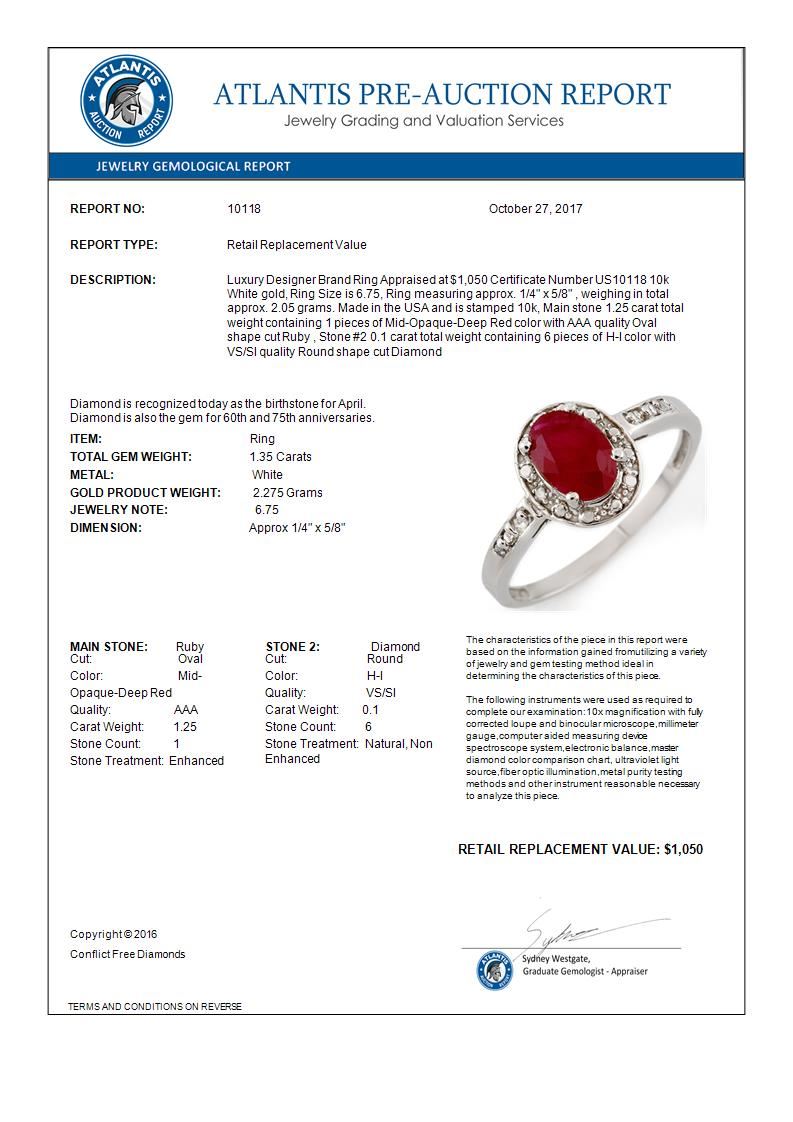 REF-15W8F -10118 ---- 1.35 CTW Ruby & Diamond Ring 10K White Gold ---- Luxury Designer Brand Ring Appraised at $1,050 Certificate Number US10118 10k White gold, Ring Size is 6.75, Ring measuring approx. 1/4" x 5/8" , weighing in total approx. 2.05 grams. Made in the USA and is stamped 10k, Main stone 1.25 carat total weight containing 1 pieces of Mid-Opaque-Deep Red color with AAA quality Oval shape cut Ruby , Stone #2 0.1 carat total weight containing 6 pieces of H-I color with VS/SI quality Round shape cut Diamond