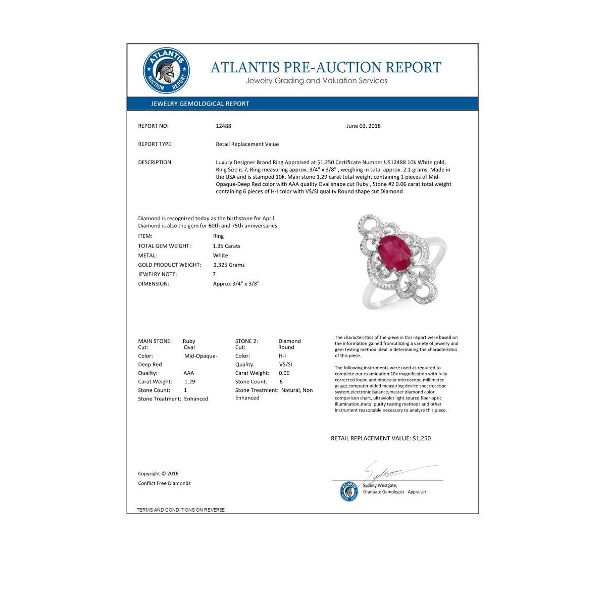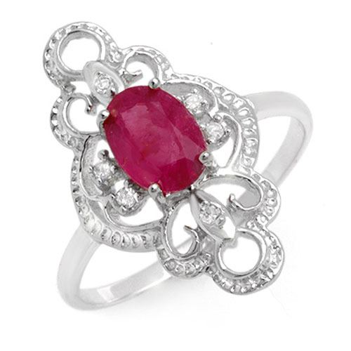 REF-18W9F -12488 ---- 1.35 CTW Ruby & Diamond Ring 10K White Gold ---- Luxury Designer Brand Ring Appraised at $1,250 Certificate Number US12488 10k White gold, Ring Size is 7, Ring measuring approx. 3/4" x 3/8" , weighing in total approx. 2.1 grams. Made in the USA and is stamped 10k, Main stone 1.29 carat total weight containing 1 pieces of Mid-Opaque-Deep Red color with AAA quality Oval shape cut Ruby , Stone #2 0.06 carat total weight containing 6 pieces of H-I color with VS/SI quality Round shape cut Diamond