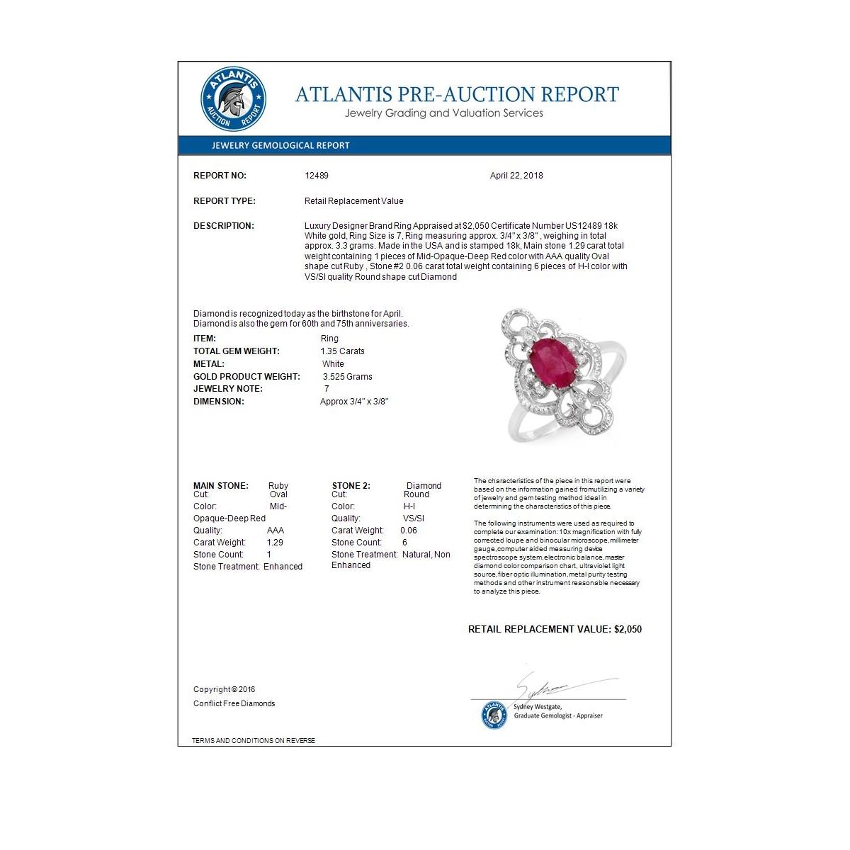 REF-31H3A -12489 ---- 1.35 CTW Ruby & Diamond Ring 18K White Gold ---- Luxury Designer Brand Ring Appraised at $2,050 Certificate Number US12489 18k White gold, Ring Size is 7, Ring measuring approx. 3/4" x 3/8" , weighing in total approx. 3.3 grams. Made in the USA and is stamped 18k, Main stone 1.29 carat total weight containing 1 pieces of Mid-Opaque-Deep Red color with AAA quality Oval shape cut Ruby , Stone #2 0.06 carat total weight containing 6 pieces of H-I color with VS/SI quality Round shape cut Diamond