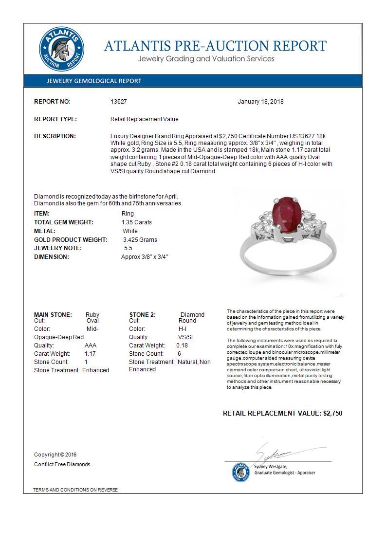 REF-41F8N -13627 ---- 1.35 CTW Ruby & Diamond Ring 18K White Gold ---- Luxury Designer Brand Ring Appraised at $2,750 Certificate Number US13627 18k White gold, Ring Size is 5.5, Ring measuring approx. 3/8" x 3/4" , weighing in total approx. 3.2 grams. Made in the USA and is stamped 18k, Main stone 1.17 carat total weight containing 1 pieces of Mid-Opaque-Deep Red color with AAA quality Oval shape cut Ruby , Stone #2 0.18 carat total weight containing 6 pieces of H-I color with VS/SI quality Round shape cut Diamond