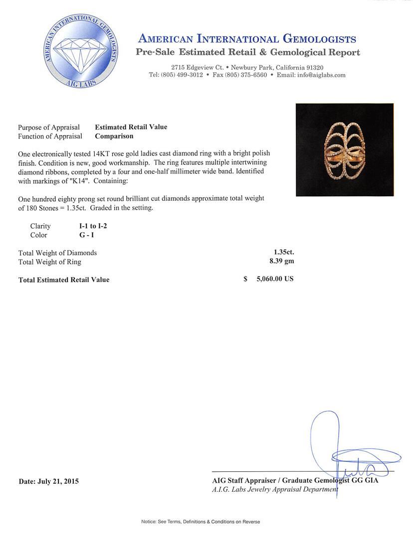 One electronically tested 14KT rose gold ladies cast diamond ring with a bright polish finish. The ring features multiple intertwining diamond ribbons, completed by a four and one-half millimeter wide band. Identified with markings of "K14". Condition is new, good workmanship. Containing: One Hundred Eighty prong set round brilliant cut diamonds approximate total weight of 180 Stones = 1.35ct. Graded in the setting. Clarity I-1 to I-2 Color G - I. Total Weight of Diamonds 1.35ct. Total Weight of Ring 8.39 grams. AIG Appraised at $5,060.00.