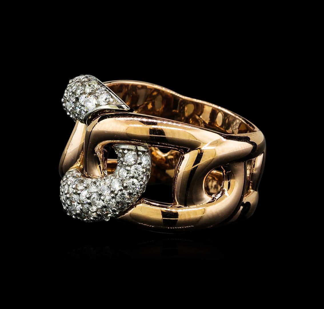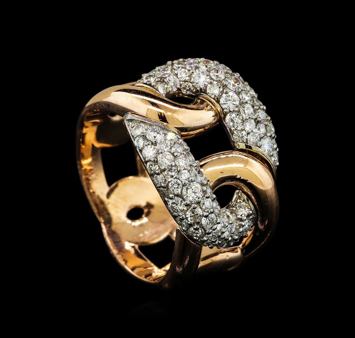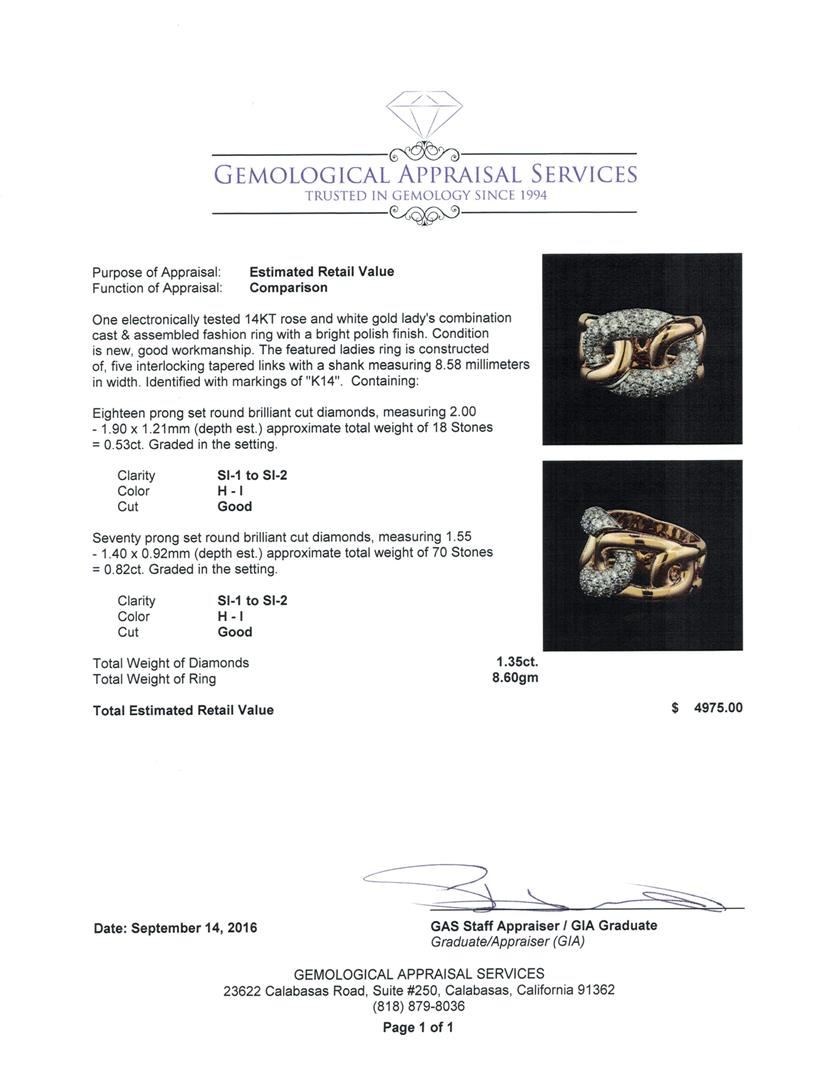 One electronically tested 14KT rose and white gold lady's combination cast & assembled fashion ring with a bright polish finish. The featured ladies ring is constructed of, five interlocking tapered links with a shank measuring 8.58 millimeters in width. Identified with markings of 'K14'. Condition is new, good workmanship. Containing: Eighteen prong set round brilliant cut diamonds, measuring 2.00 - 1.90 x 1.21mm (depth est.) approximate total weight of 18 Stones = 0.53ct. Graded in the setting. Clarity SI-1 to SI-2. Color: H - I Cut Good Seventy prong set round brilliant cut diamonds, measuring 1.55 - 1.40 x 0.92mm (depth est.) approximate total weight of 70 Stones = 0.82ct. Graded in the setting. Clarity SI-1 to SI-2. Color: H - I Cut Good. Total Weight of Diamonds 1.35ct.. Total Weight of Ring 8.60gm GAS Appraised at $4,975.00.