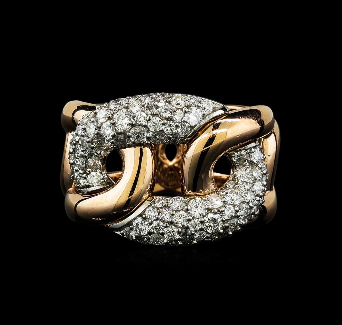 One electronically tested 14KT rose and white gold lady's combination cast & assembled fashion ring with a bright polish finish. The featured ladies ring is constructed of, five interlocking tapered links with a shank measuring 8.58 millimeters in width. Identified with markings of 'K14'. Condition is new, good workmanship. Containing: Eighteen prong set round brilliant cut diamonds, measuring 2.00 - 1.90 x 1.21mm (depth est.) approximate total weight of 18 Stones = 0.53ct. Graded in the setting. Clarity SI-1 to SI-2. Color: H - I Cut Good Seventy prong set round brilliant cut diamonds, measuring 1.55 - 1.40 x 0.92mm (depth est.) approximate total weight of 70 Stones = 0.82ct. Graded in the setting. Clarity SI-1 to SI-2. Color: H - I Cut Good. Total Weight of Diamonds 1.35ct.. Total Weight of Ring 8.60gm GAS Appraised at $4,975.00.