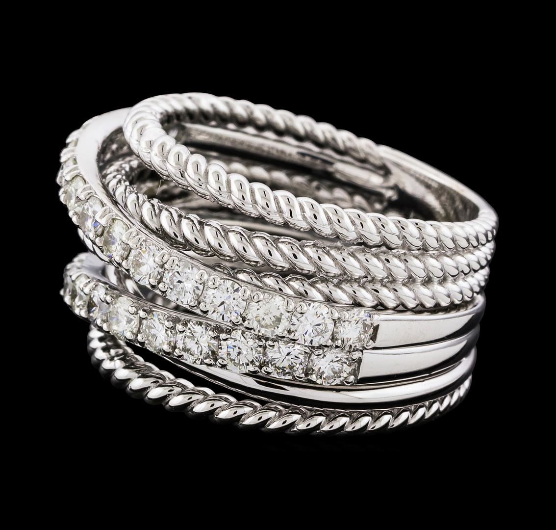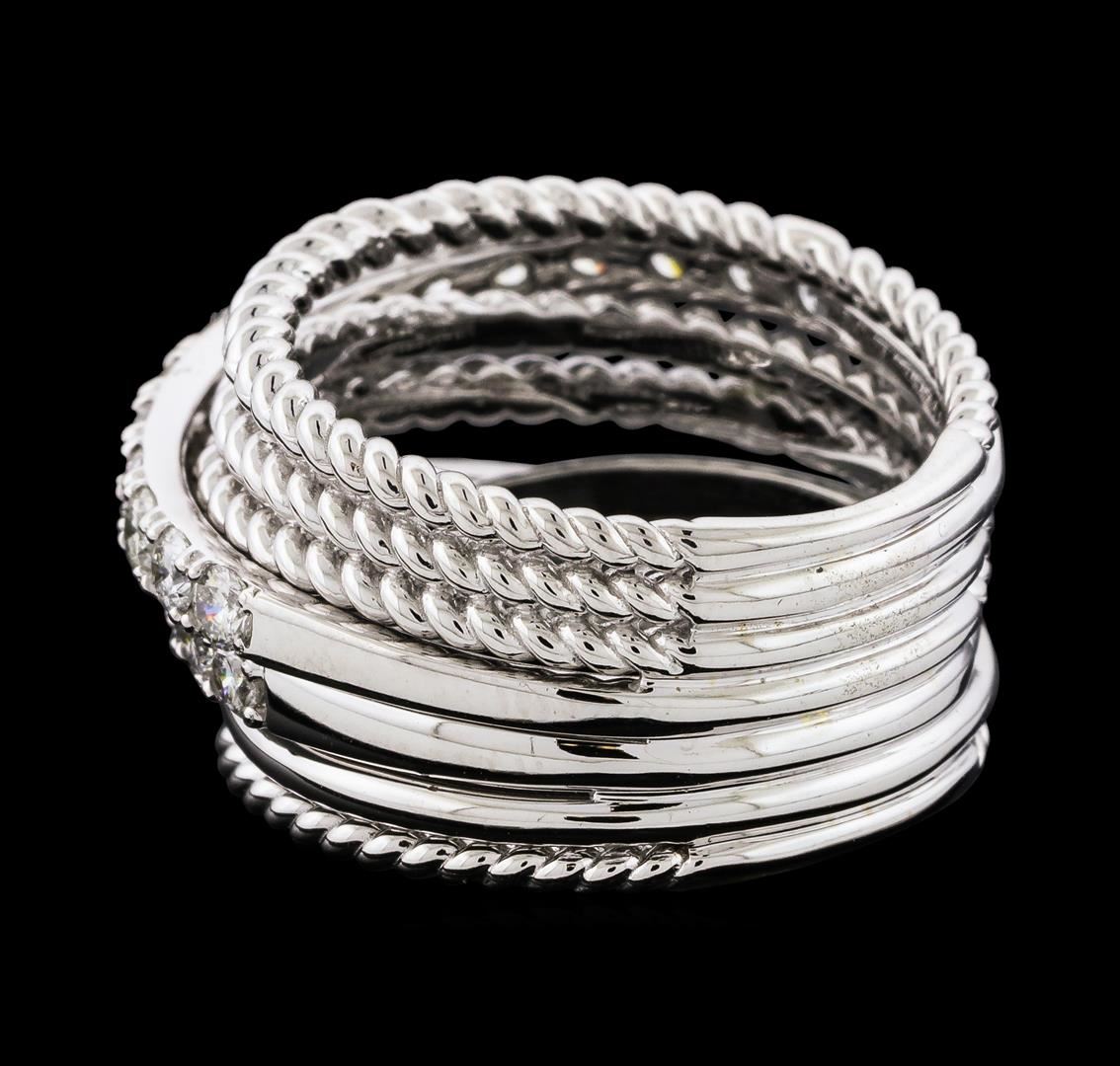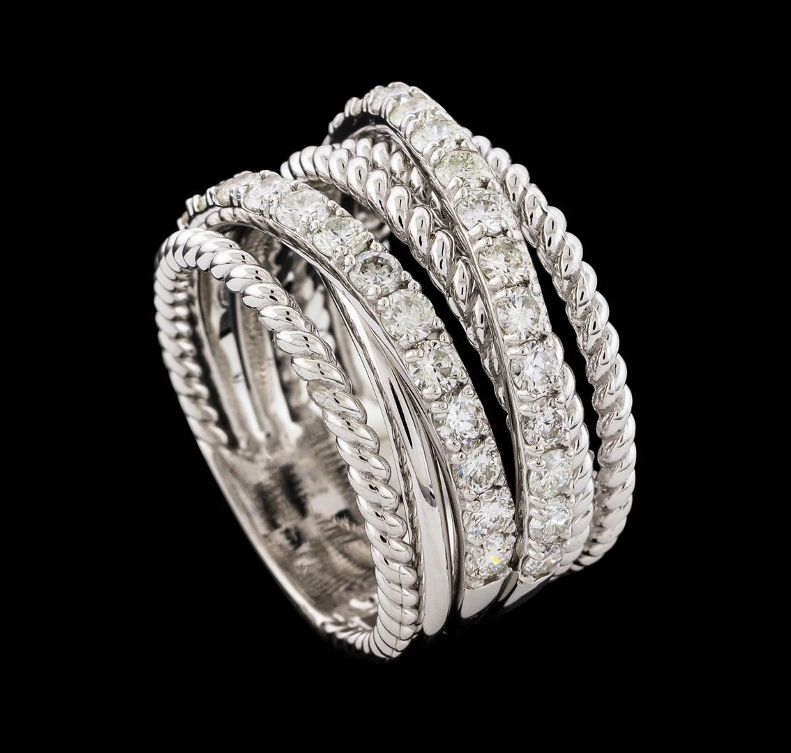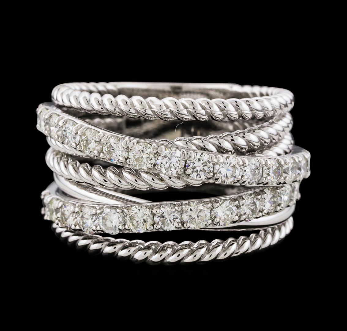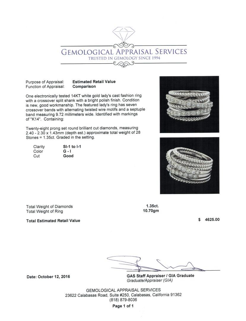 One electronically tested 14KT white gold lady's cast fashion ring with a crossover split shank with a bright polish finish. The featured lady's ring has seven crossover bands with alternating twisted wire motifs and a septuple band measuring 9.72 millimeters wide. Identified with markings of 'K14'. Condition is new, good workmanship. Containing: Twenty-Eight prong set round brilliant cut diamonds, measuring 2.40 - 2.30 x 1.43mm (depth est.) approximate total weight of 28 Stones = 1.35ct. Graded in the setting. Clarity SI-1 to I-1. Color: G - I Cut Good. Total Weight of Diamonds 1.35ct.. Total Weight of Ring 10.70gm. GAS Appraised at $4,625.00.