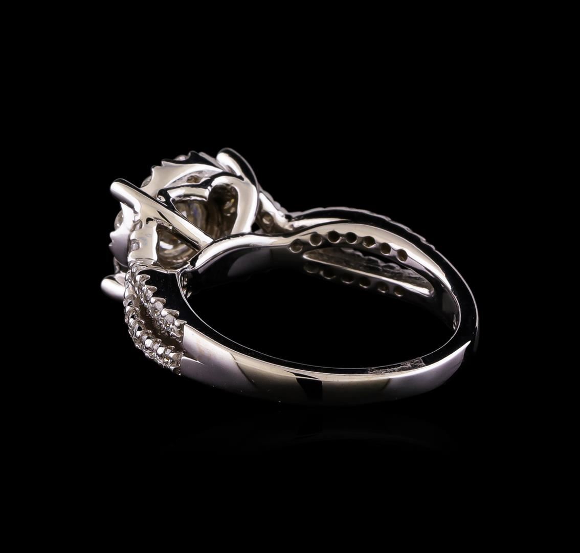 One electronically tested 14KT white gold lady's cast wedding ring with a crossover shank basket halo with a bright polish finish. The featured lady's ring has a shank measuring 2.18 millimeters wide. Identified with markings of '585'. Condition is new, good workmanship. Containing: One prong set round brilliant cut diamond, measuring 5.20 - 5.10 x 3.19mm (depth est.) approximate weight of 0.55ct. Graded in the setting. Clarity I-1. Color: G - H Cut Good Ten prong set round brilliant cut diamonds, measuring 2.30 - 2.20 x 1.40mm (depth est.) approximate total weight of 10 Stones = 0.43ct. Graded in the setting. Clarity SI-1 to SI-2. Color: H - I Cut Good Thirty-Six prong set round brilliant cut diamonds, measuring 1.45 - 1.35 x 0.87mm (depth est.) approximate total weight of 36 Stones = 0.37ct. Graded in the setting. Clarity SI-1 to SI-2. Color: H - I Cut Good. Total Weight of Diamonds 1.35ct.. Total Weight of Ring 5.00gm. GAS Appraised at $6,425.00.