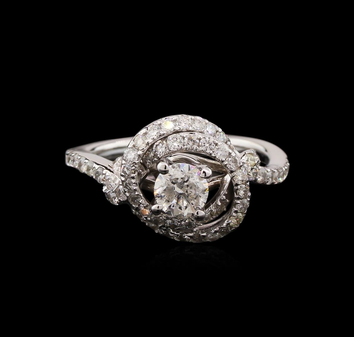 One electronically tested 14KT white gold lady's combination cast & assembled fashion ring with a bright polish finish. The featured lady's ring has an overlapping double swirl motif and a shank measuring 2.09 millimeters wide. Identified with markings of "K14". Condition is new, good workmanship. Containing: One prong set round brilliant cut diamond, measuring 4.89 - 4.87 x 3.32mm (depth est.) , 10.00.%. GTCF approximate weight of 0.55ct. Graded in the setting. Clarity: I-1. Color: I. Cut Good Sixty-Six prong set round brilliant cut diamonds, measuring 1.50 - 1.40 x 0.94mm (depth est.) approximate total weight of 66 Stones = 0.80ct. Graded in the setting. Clarity: SI-1 to I-1. Color: H - I. Cut Good. Total Weight of Diamonds 1.35ct. Total Weight of Ring 4.50gm. GAS Appraised at $6,000.00.