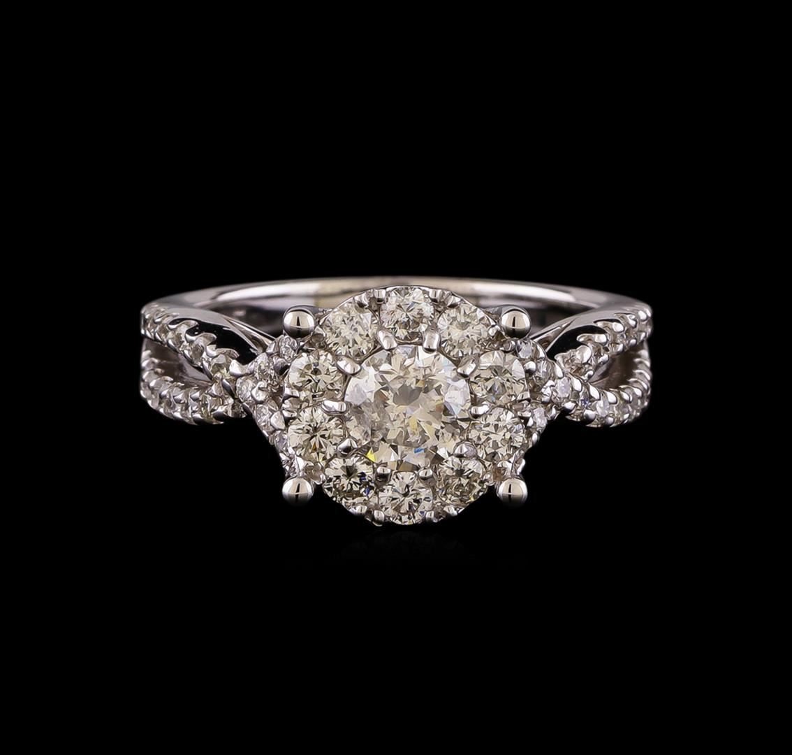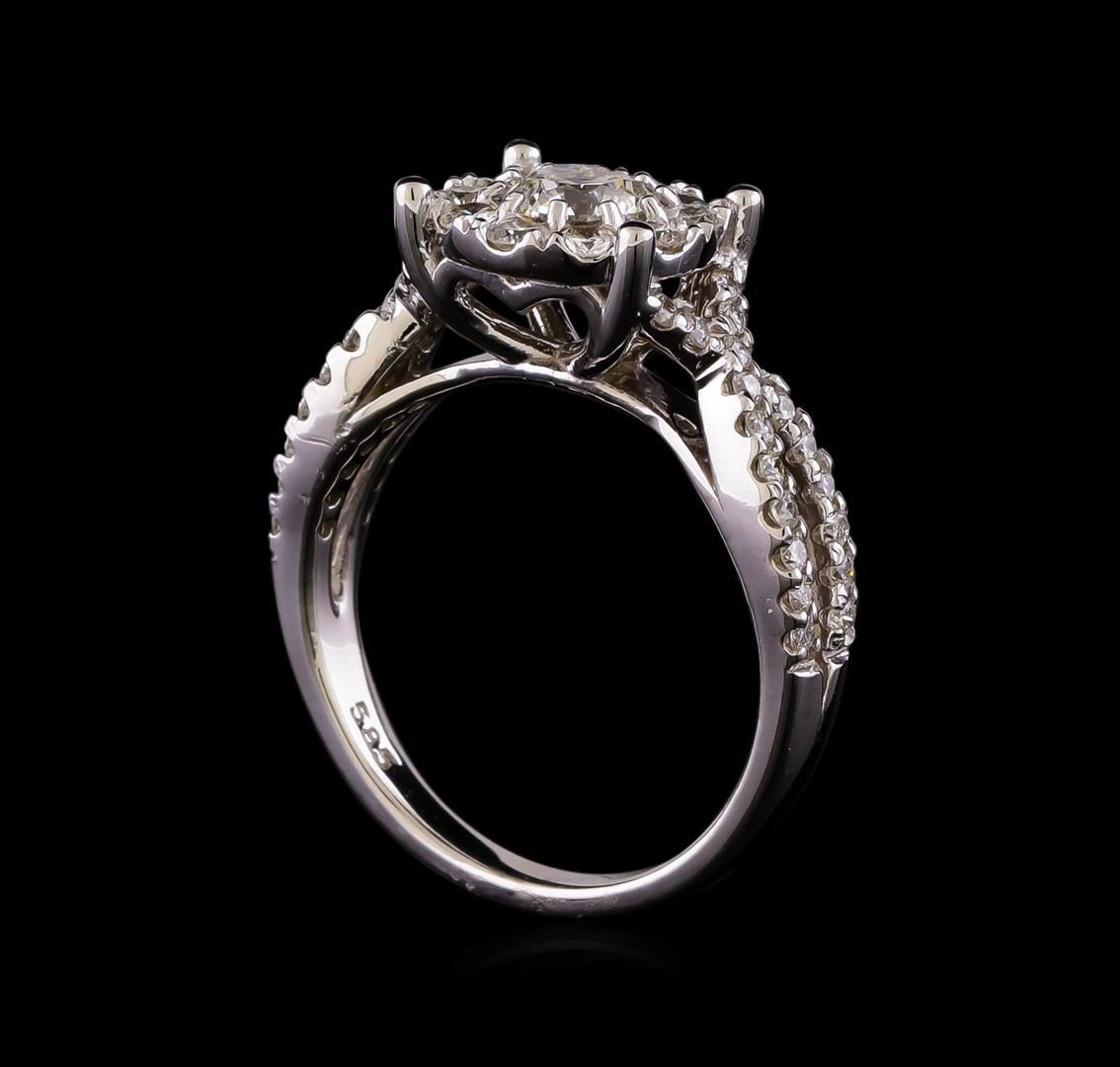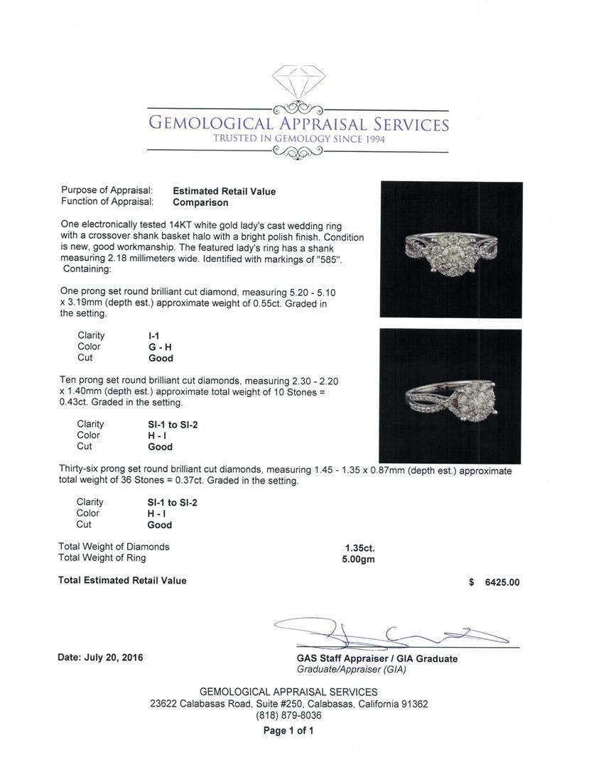One electronically tested 14KT white gold lady's cast wedding ring with a crossover shank basket halo with a bright polish finish. The featured lady's ring has a shank measuring 2.18 millimeters wide. Identified with markings of '585'. Condition is new, good workmanship. Containing: One prong set round brilliant cut diamond, measuring 5.20 - 5.10 x 3.19mm (depth est.) approximate weight of 0.55ct. Graded in the setting. Clarity I-1. Color: G - H Cut Good Ten prong set round brilliant cut diamonds, measuring 2.30 - 2.20 x 1.40mm (depth est.) approximate total weight of 10 Stones = 0.43ct. Graded in the setting. Clarity SI-1 to SI-2. Color: H - I Cut Good Thirty-Six prong set round brilliant cut diamonds, measuring 1.45 - 1.35 x 0.87mm (depth est.) approximate total weight of 36 Stones = 0.37ct. Graded in the setting. Clarity SI-1 to SI-2. Color: H - I Cut Good. Total Weight of Diamonds 1.35ct.. Total Weight of Ring 5.00gm. GAS Appraised at $6,425.00.