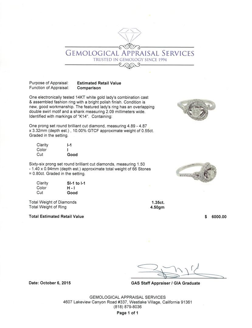 One electronically tested 14KT white gold lady's combination cast & assembled fashion ring with a bright polish finish. The featured lady's ring has an overlapping double swirl motif and a shank measuring 2.09 millimeters wide. Identified with markings of "K14". Condition is new, good workmanship. Containing: One prong set round brilliant cut diamond, measuring 4.89 - 4.87 x 3.32mm (depth est.) , 10.00.%. GTCF approximate weight of 0.55ct. Graded in the setting. Clarity: I-1. Color: I. Cut Good Sixty-Six prong set round brilliant cut diamonds, measuring 1.50 - 1.40 x 0.94mm (depth est.) approximate total weight of 66 Stones = 0.80ct. Graded in the setting. Clarity: SI-1 to I-1. Color: H - I. Cut Good. Total Weight of Diamonds 1.35ct. Total Weight of Ring 4.50gm. GAS Appraised at $6,000.00.